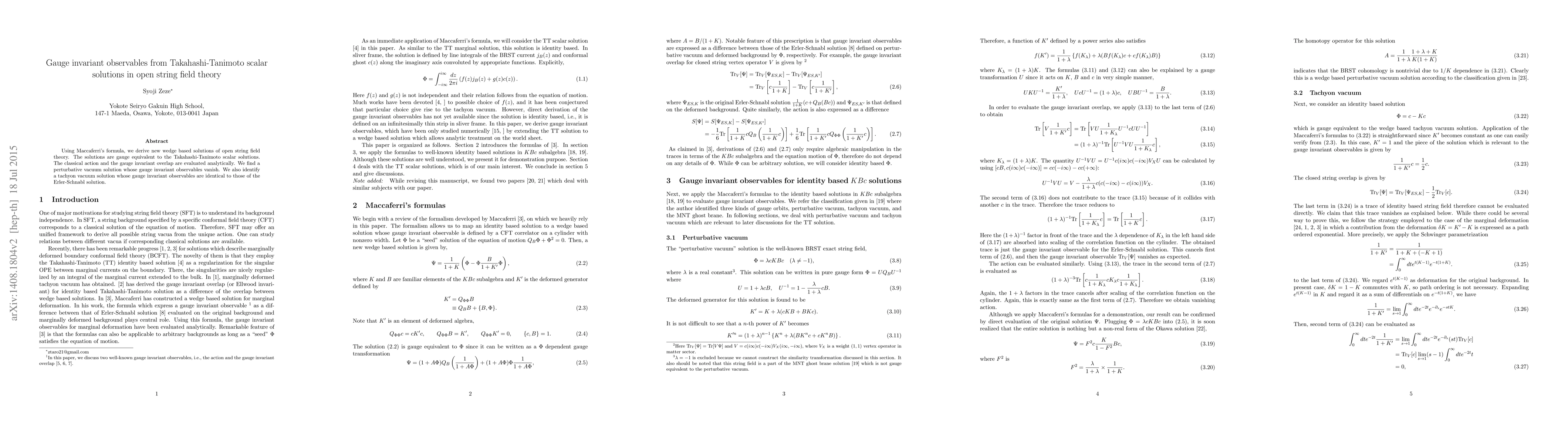 Using Maccaferri's formula, we derive new wedge based solutions of open string field theory. The solutions are gauge equivalent to the Takahashi-Tanimoto scalar solutions. The classical action and the gauge invariant overlap are evaluated analytically. We find a perturbative vacuum solution whose gauge invariant observables vanish. We also identify a tachyon vacuum solution whose gauge invariant observables are identical to those of the Erler-Schnabl solution.