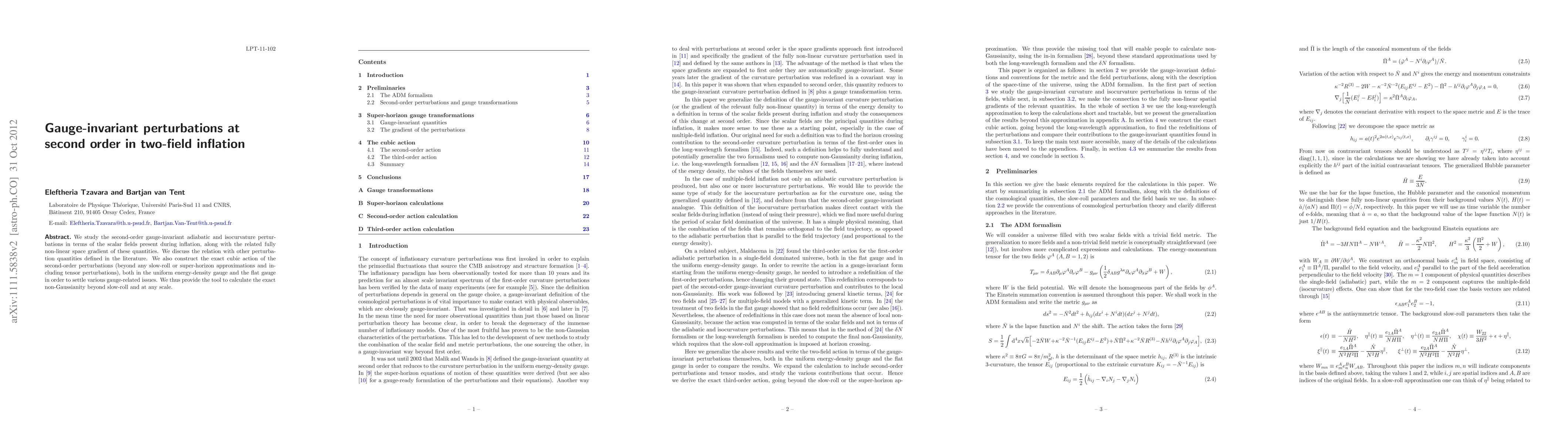 This paper investigates second-order gauge-invariant perturbations in two-field inflation, constructing the exact cubic action for these perturbations in both uniform energy density and flat gauges. It provides tools for calculating non-Gaussianities beyond slow-roll approximations at any scale.