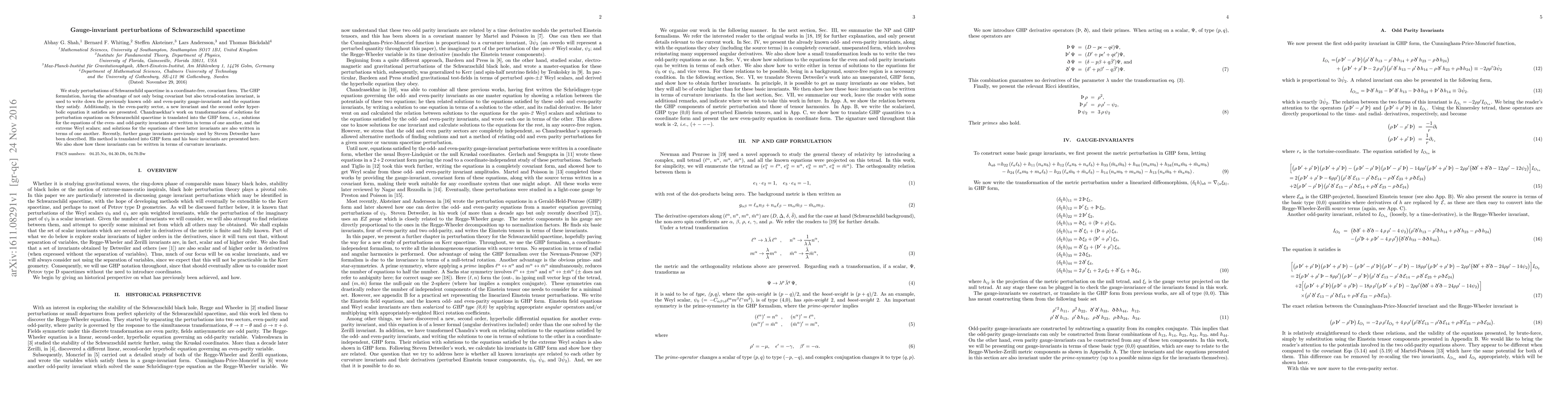 This paper investigates gauge-invariant perturbations of Schwarzschild spacetime using the GHP formulation, presenting known and new invariants and their equations. It translates Chandrasekhar's and Detweiler's methods into this covariant framework and relates the invariants to curvature invariants.