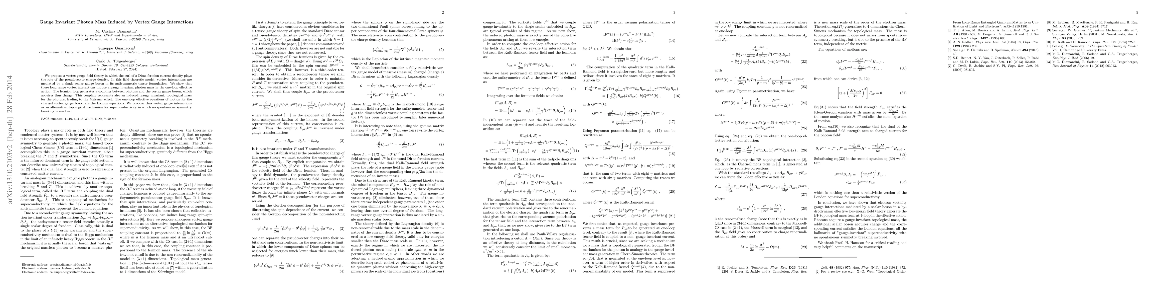 We propose a vortex gauge field theory in which the curl of a Dirac fermion current density plays the role of the pseudovector charge density. In this field-theoretic model, vortex interactions are mediated by a single scalar gauge boson in its antisymmetric tensor formulation. We show that these long range vortex interactions induce a gauge invariant photon mass in the one-loop effective action. The fermion loop generates a coupling between photons and the vortex gauge boson, which acquires thus charge. This coupling represents also an induced, gauge invariant, topological mass for the photons, leading to the Meissner effect. The one-loop effective equations of motion for the charged vortex gauge boson are the London equations. We propose thus vortex gauge interactions as an alternative, topological mechanism for superconductivity in which no spontaneous symmetry breaking is involved.
