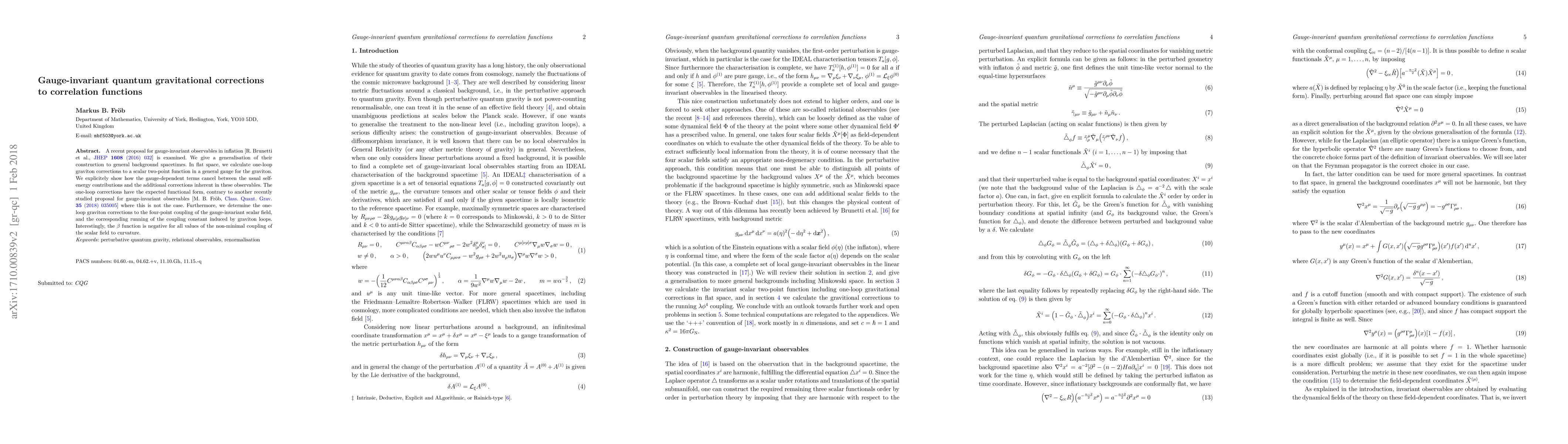 A recent proposal for gauge-invariant observables in inflation [R. Brunetti et al., JHEP 1608 (2016) 032] is examined. We give a generalisation of their construction to general background spacetimes. In flat space, we calculate one-loop graviton corrections to a scalar two-point function in a general gauge for the graviton. We explicitely show how the gauge-dependent terms cancel between the usual self-energy contributions and the additional corrections inherent in these observables. The one-loop corrections have the expected functional form, contrary to another recently studied proposal for gauge-invariant observables [M. B. Fr\"ob, Class. Quant. Grav. 35 (2018) 035005] where this is not the case. Furthermore, we determine the one-loop graviton corrections to the four-point coupling of the gauge-invariant scalar field, and the corresponding running of the coupling constant induced by graviton loops. Interestingly, the $\beta$ function is negative for all values of the non-minimal coupling of the scalar field to curvature.