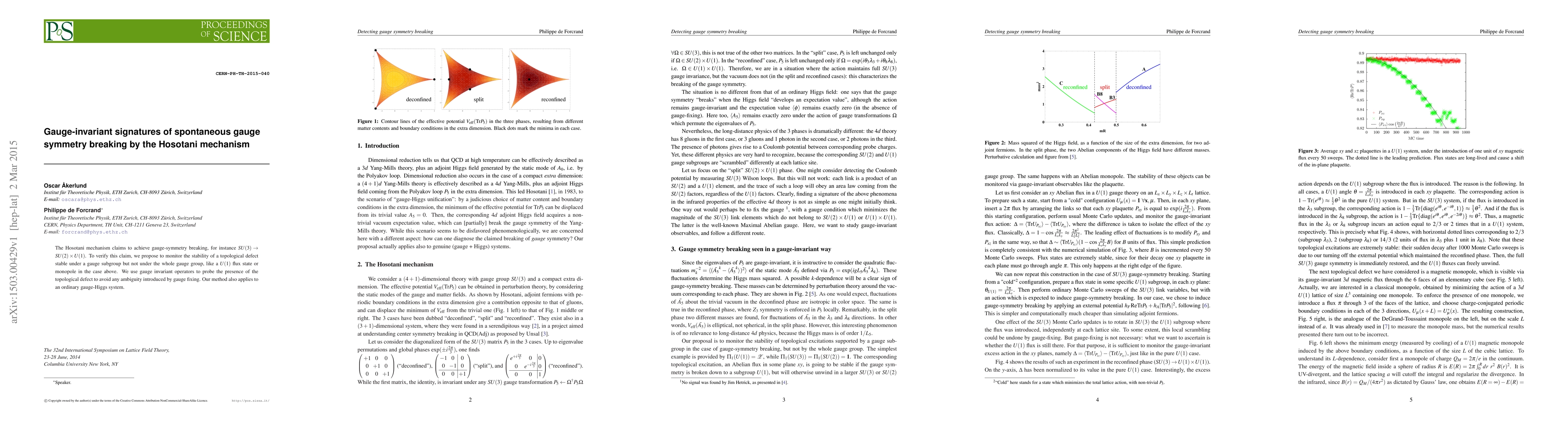 The Hosotani mechanism claims to achieve gauge-symmetry breaking, for instance $SU(3) \to SU(2)\times U(1)$. To verify this claim, we propose to monitor the stability of a topological defect stable under a gauge subgroup but not under the whole gauge group, like a $U(1)$ flux state or monopole in the case above. We use gauge invariant operators to probe the presence of the topological defect to avoid any ambiguity introduced by gauge fixing. Our method also applies to an ordinary gauge-Higgs system.
