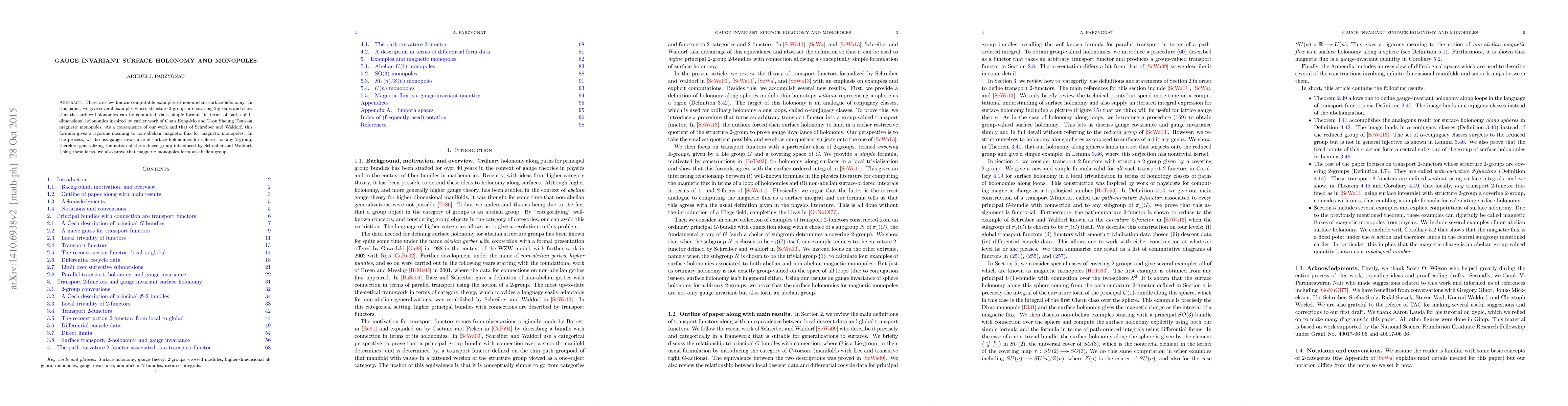 This paper presents computable examples of non-abelian surface holonomy via a formula derived from paths of 1-dimensional holonomies, providing a rigorous meaning to non-abelian magnetic flux for magnetic monopoles. It generalizes gauge covariance for surface holonomies and proves that magnetic monopoles have an abelian group structure.