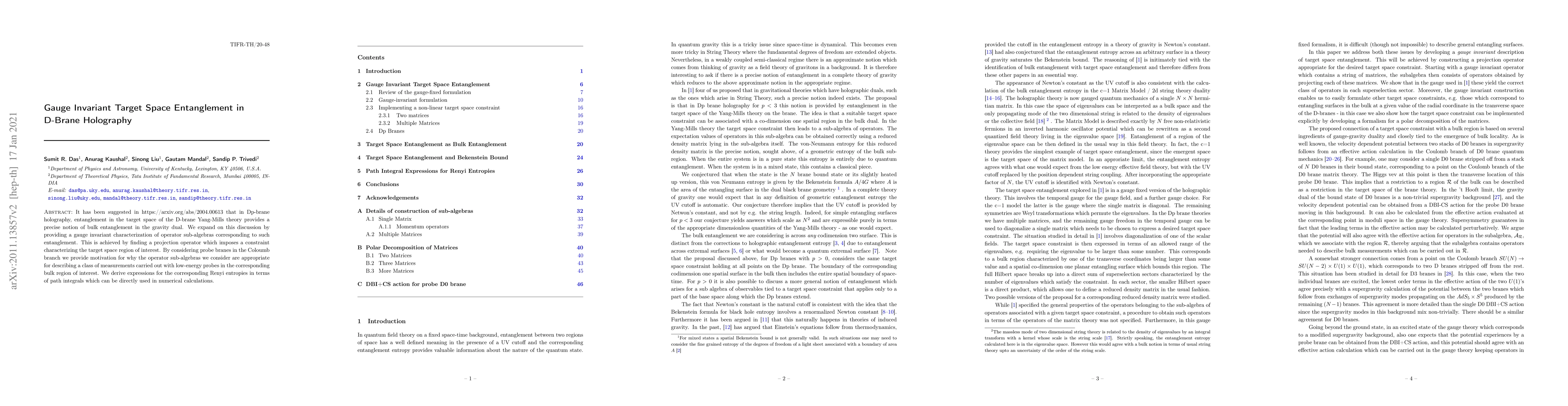 It has been suggested in arXiv:2004.00613 that in Dp-brane holography, entanglement in the target space of the D-brane Yang-Mills theory provides a precise notion of bulk entanglement in the gravity dual. We expand on this discussion by providing a gauge invariant characterization of operator sub-algebras corresponding to such entanglement. This is achieved by finding a projection operator which imposes a constraint characterizing the target space region of interest. By considering probe branes in the Coulomb branch we provide motivation for why the operator sub-algebras we consider are appropriate for describing a class of measurements carried out with low-energy probes in the corresponding bulk region of interest. We derive expressions for the corresponding Renyi entropies in terms of path integrals which can be directly used in numerical calculations.
