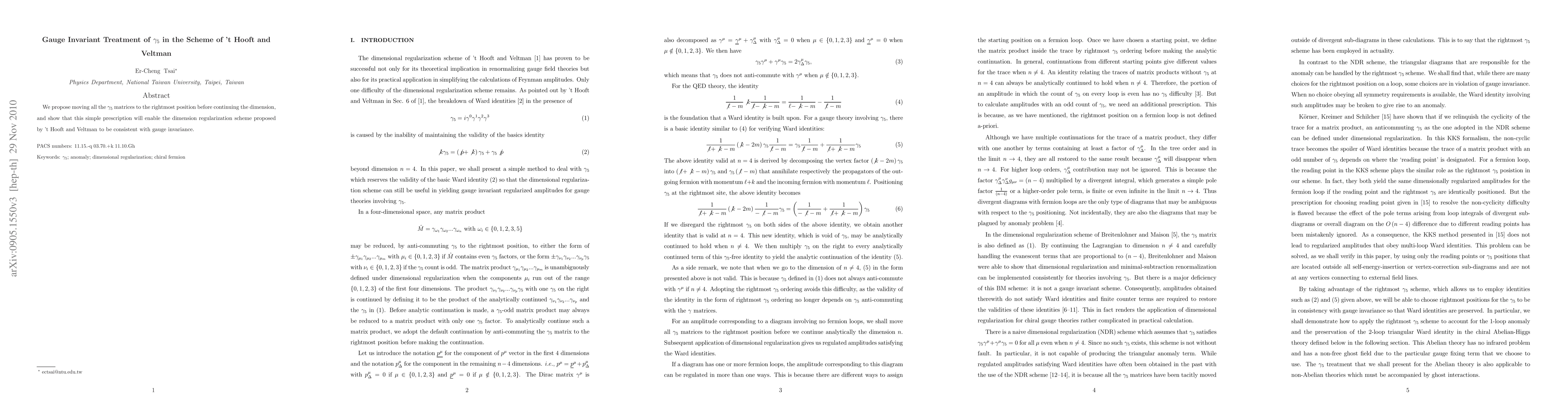 This paper proposes a method to consistently apply the 't Hooft-Veltman scheme for dimensional regularization by relocating all $\gamma_{5}$ matrices to the rightmost position, ensuring gauge invariance in the process. This approach simplifies the regularization scheme while maintaining theoretical consistency.