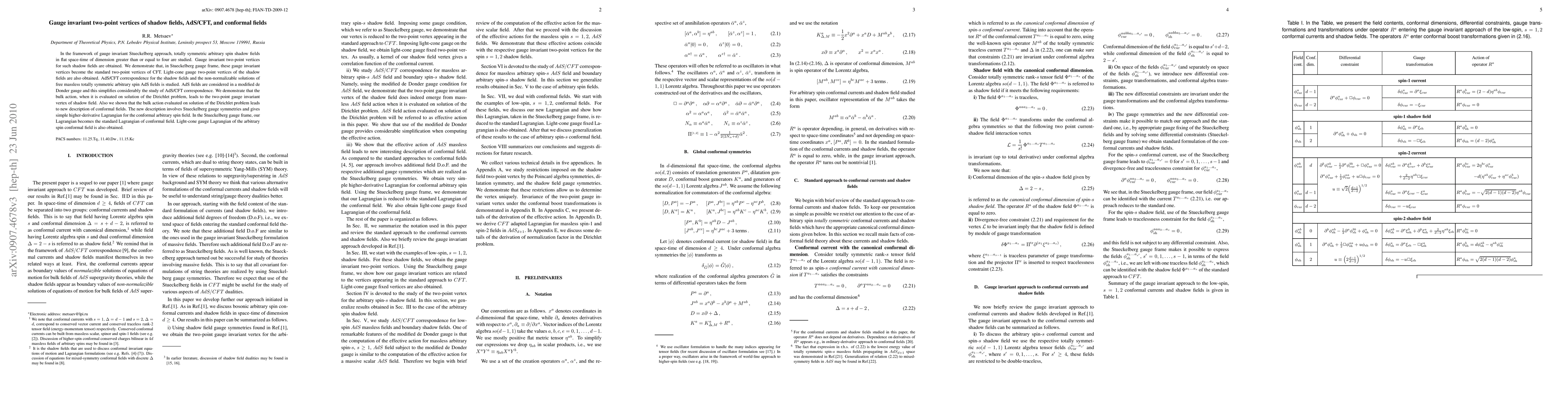 This paper explores gauge invariant two-point vertices for shadow fields using the Stueckelberg approach, demonstrating their equivalence to conformal field theory vertices. It also investigates the AdS/CFT correspondence for these fields, showing that the bulk action evaluated on Dirichlet solutions provides a new description of conformal fields involving Stueckelberg gauge symmetries.
