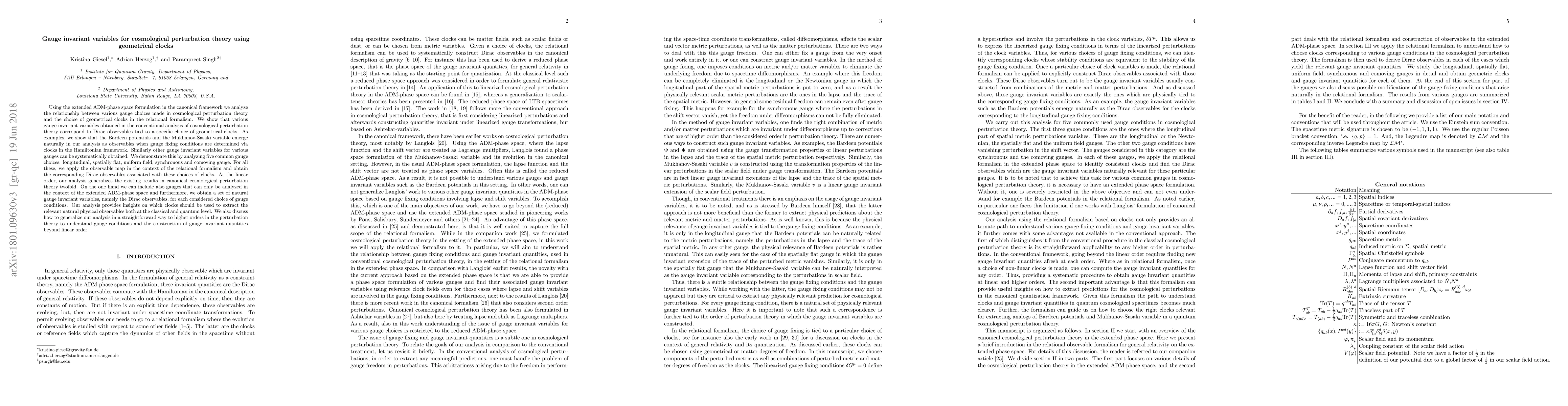 This research paper employs the extended ADM-phase space formulation to analyze cosmological perturbation theory, demonstrating that gauge invariant variables correspond to Dirac observables linked to specific geometrical clocks. The study generalizes existing results by identifying natural gauge invariant variables, such as Bardeen potentials and the Mukhanov-Sasaki variable, for various common gauge choices, thus providing insights for both classical and quantum cosmological analyses.
