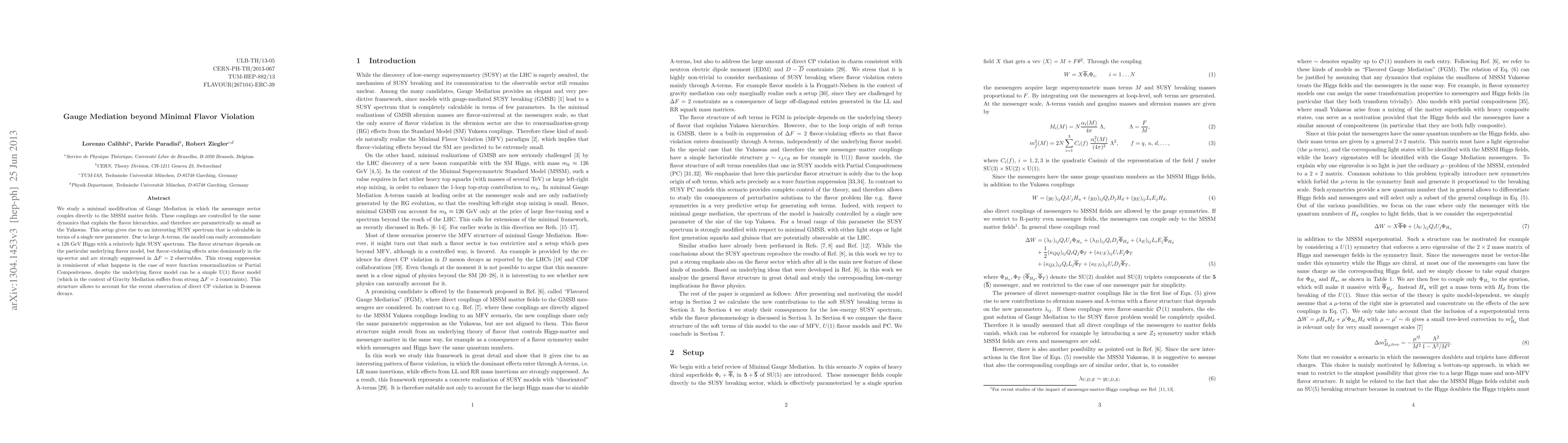 This paper proposes a modified gauge mediation framework where the messenger sector interacts directly with MSSM matter fields, leading to a calculable SUSY spectrum with a single new parameter. The model accommodates a 126 GeV Higgs and suppresses flavor-violating effects, especially in Delta F =2 observables, aligning with recent CP violation observations in D-meson decays.