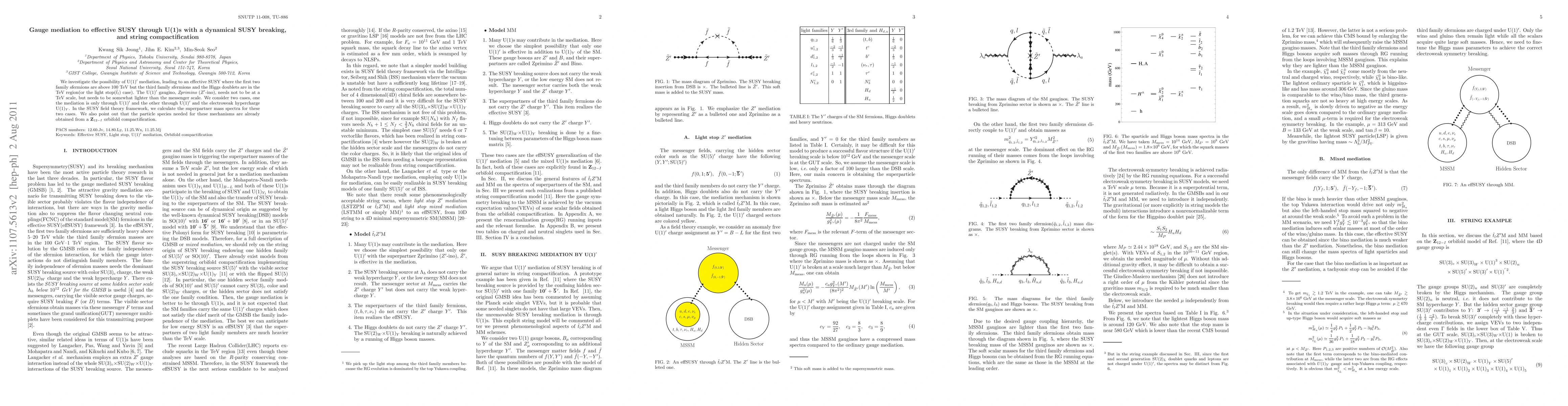 We investigate the possibility of U(1)' mediation, leading to an effective SUSY where the first two family sfermions are above 100 TeV but the third family sfermions and the Higgs doublets are in the TeV region(or the light stop case). The U(1)' gaugino, Zprimino, needs not to be at a TeV scale, but needs to be somewhat lighter than the messenger scale. We consider two cases, one the mediation is only through U(1)' and the other through U(1)' and the electroweak hypercharge U(1)_Y. In the SUSY field theory framework, we calculate the superpartner mass spectra for these two cases. We also point out that the particle species needed for these mechanisms are already obtained from a Z(12-I) orbifold compactification.