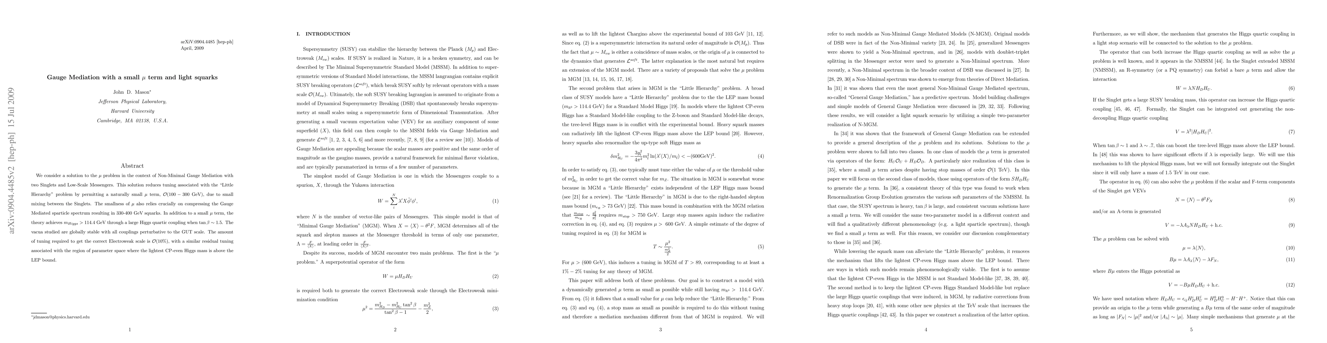 We consider a solution to the mu problem in the context of Non-Minimal Gauge Mediation with two Singlets and Low-Scale Messengers. This solution reduces tuning associated with the "Little Hierarchy" problem by permitting a naturally small mu term (100-300 GeV) due to small mixing between the Singlets. The smallness of mu also relies crucially on compressing the Gauge Mediated sparticle spectrum resulting in 330-400 GeV squarks. In addition to a small mu term, the theory achieves a Higgs mass > 114.4 GeV through a large Higgs quartic coupling when tanbeta ~ 1.5. The vacua studied are globally stable with all couplings perturbative to the GUT scale. The amount of tuning required to get the correct Electroweak scale is of order 10%, with a similar residual tuning associated with the region of parameter space where the lightest CP-even Higgs mass is above the LEP bound.