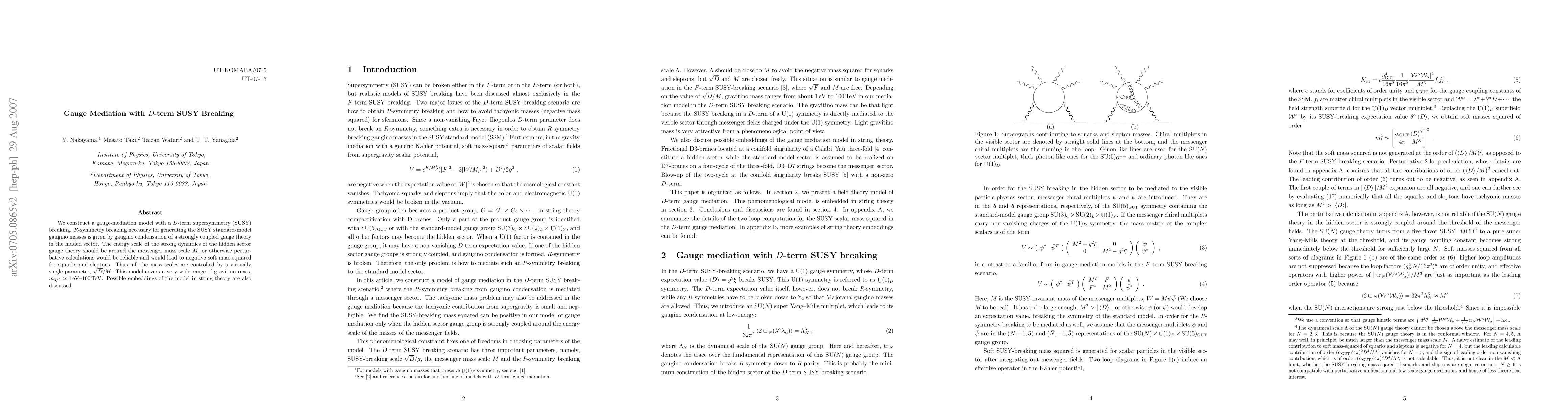 This paper presents a gauge mediation model utilizing D-term SUSY breaking, where R-symmetry breaking arises from hidden sector gauge theory condensation. The model controls mass scales through a single parameter \sqrt{D}/M, spanning a broad gravitino mass range and considering string theory embeddings.