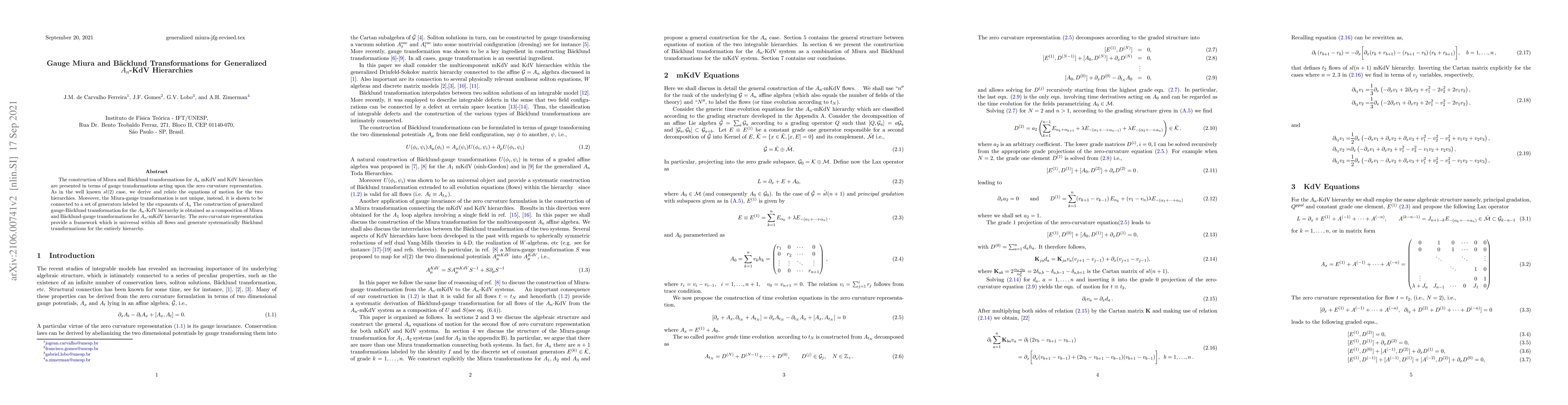 The construction of Miura and B\"acklund transformations for $A_n$ mKdV and KdV hierarchies are presented in terms of gauge transformations acting upon the zero curvature representation. As in the well known $sl(2)$ case, we derive and relate the equations of motion for the two hierarchies. Moreover, the Miura-gauge transformation is not unique, instead, it is shown to be connected to a set of generators labeled by the exponents of $A_n$ The construction of generalized gauge-B\"acklund transformation for the $A_n$-KdV hierarchy is obtained as a composition of Miura and B\"acklund-gauge transformations for $A_n$-mKdV hierarchy. The zero curvature representation provide a framework which is universal within all flows and generate systematically B\"acklund transformations for the entirely hierarchy.