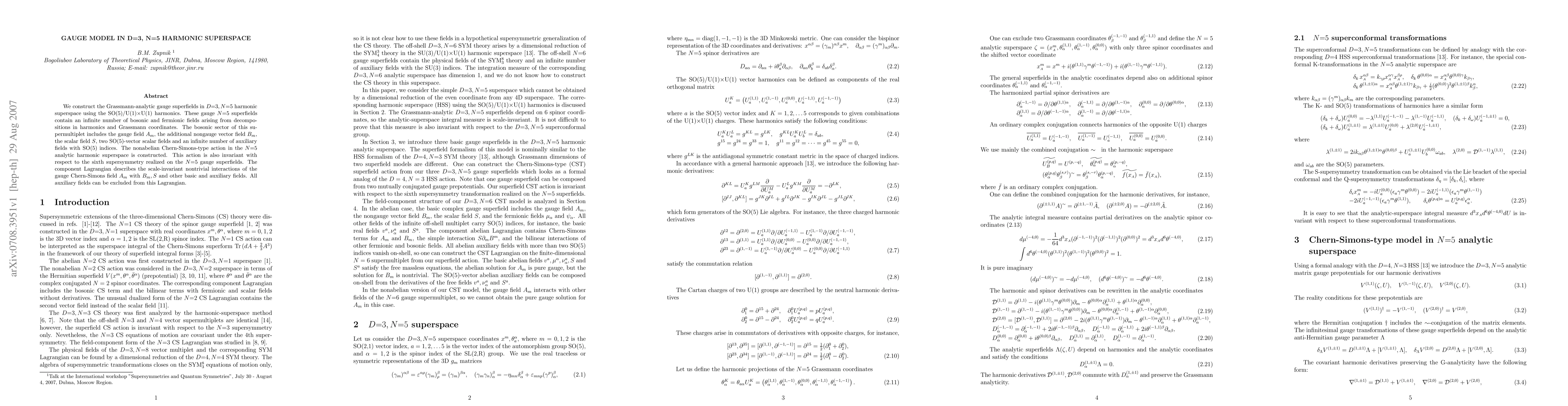 This paper constructs gauge superfields in D=3, N=5 harmonic superspace using SO(5)/U(1)xU(1) harmonics, detailing an infinite set of fields. It also develops a nonabelian Chern-Simons-type action invariant under a sixth supersymmetry, describing scale-invariant interactions of gauge fields with other fields.