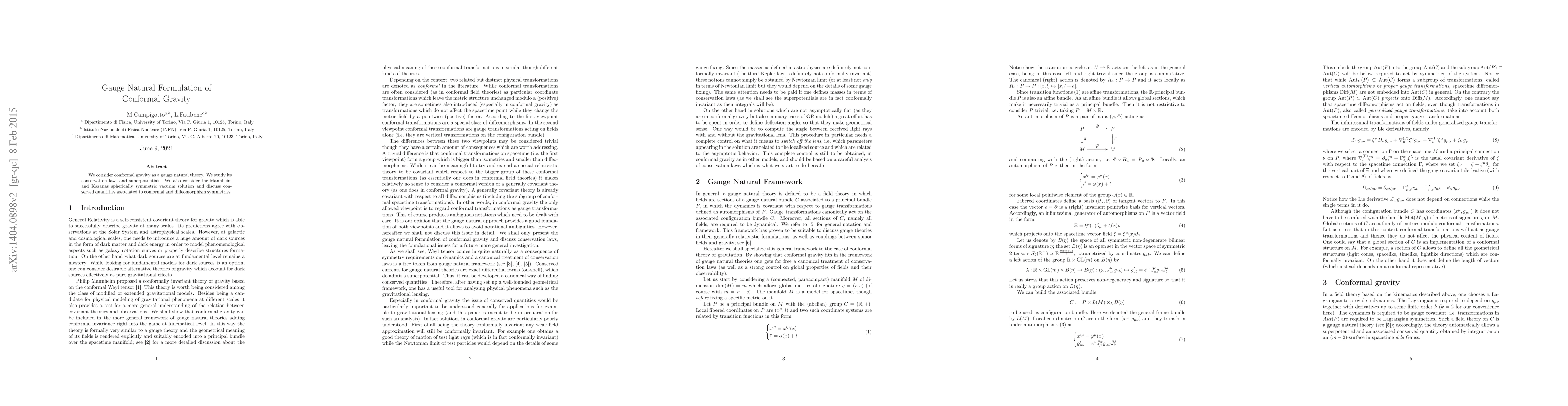 This paper explores conformal gravity within a gauge natural framework, examining its conservation laws and superpotentials. It also analyzes the Mannheim and Kazanas spherically symmetric vacuum solution to discuss conserved quantities linked to conformal and diffeomorphism symmetries.