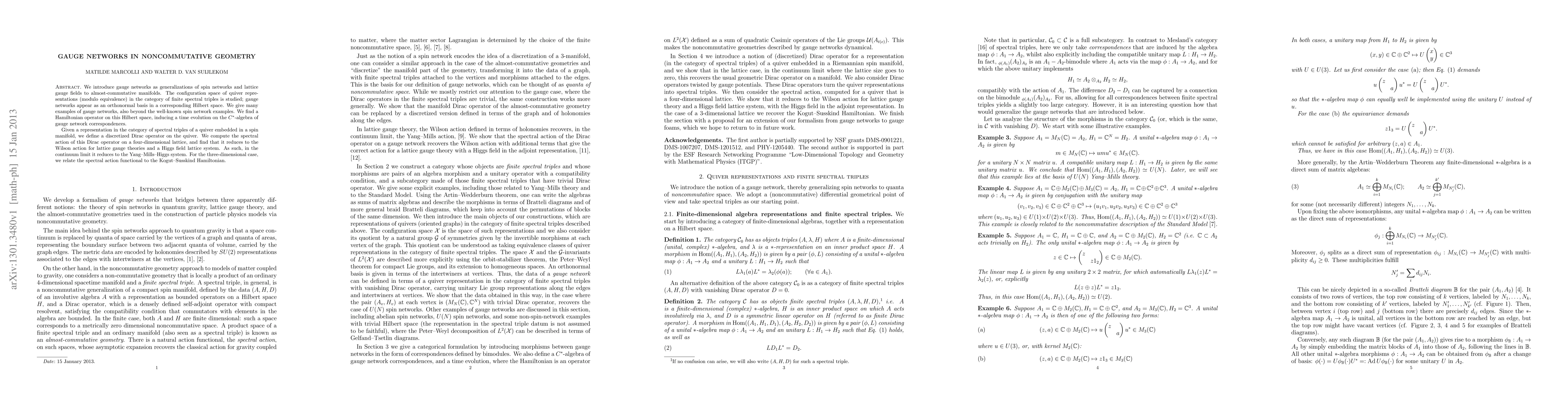 We introduce gauge networks as generalizations of spin networks and lattice gauge fields to almost-commutative manifolds. The configuration space of quiver representations (modulo equivalence) in the category of finite spectral triples is studied; gauge networks appear as an orthonormal basis in a corresponding Hilbert space. We give many examples of gauge networks, also beyond the well-known spin network examples. We find a Hamiltonian operator on this Hilbert space, inducing a time evolution on the C*-algebra of gauge network correspondences. Given a representation in the category of spectral triples of a quiver embedded in a spin manifold, we define a discretized Dirac operator on the quiver. We compute the spectral action of this Dirac operator on a four-dimensional lattice, and find that it reduces to the Wilson action for lattice gauge theories and a Higgs field lattice system. As such, in the continuum limit it reduces to the Yang-Mills-Higgs system. For the three-dimensional case, we relate the spectral action functional to the Kogut-Susskind Hamiltonian.