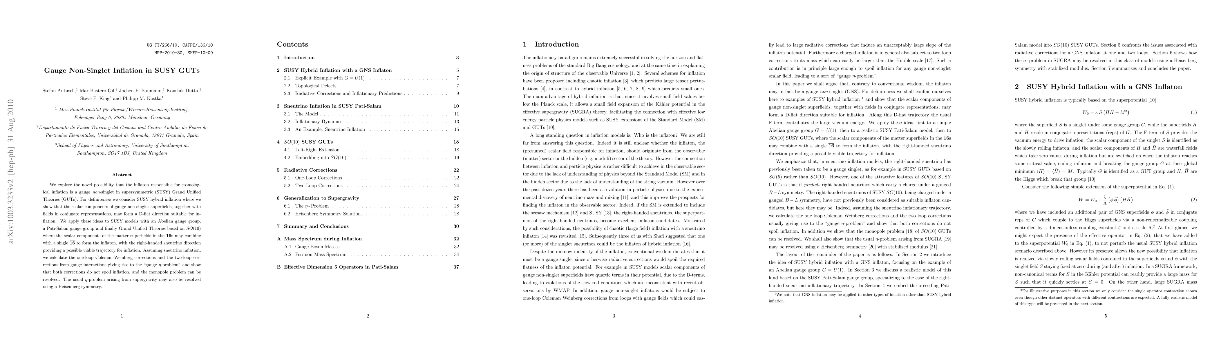 We explore the novel possibility that the inflaton responsible for cosmological inflation is a gauge non-singlet in supersymmetric (SUSY) Grand Unified Theories (GUTs). For definiteness we consider SUSY hybrid inflation where we show that the scalar components of gauge non-singlet superfields, together with fields in conjugate representations, may form a D-flat direction suitable for inflation. We apply these ideas to SUSY models with an Abelian gauge group, a Pati-Salam gauge group and finally Grand Unified Theories based on SO(10) where the scalar components of the matter superfields in the $\sixteen$s may combine with a single $\bar {sixteen}$ to form the inflaton, with the right-handed sneutrino direction providing a possible viable trajectory for inflation. Assuming sneutrino inflation, we calculate the one-loop Coleman-Weinberg corrections and the two-loop corrections from gauge interactions giving rise to the "gauge \eta-problem" and show that both corrections do not spoil inflation, and the monopole problem can be resolved. The usual \eta-problem arising from supergravity may also be resolved using a Heisenberg symmetry.