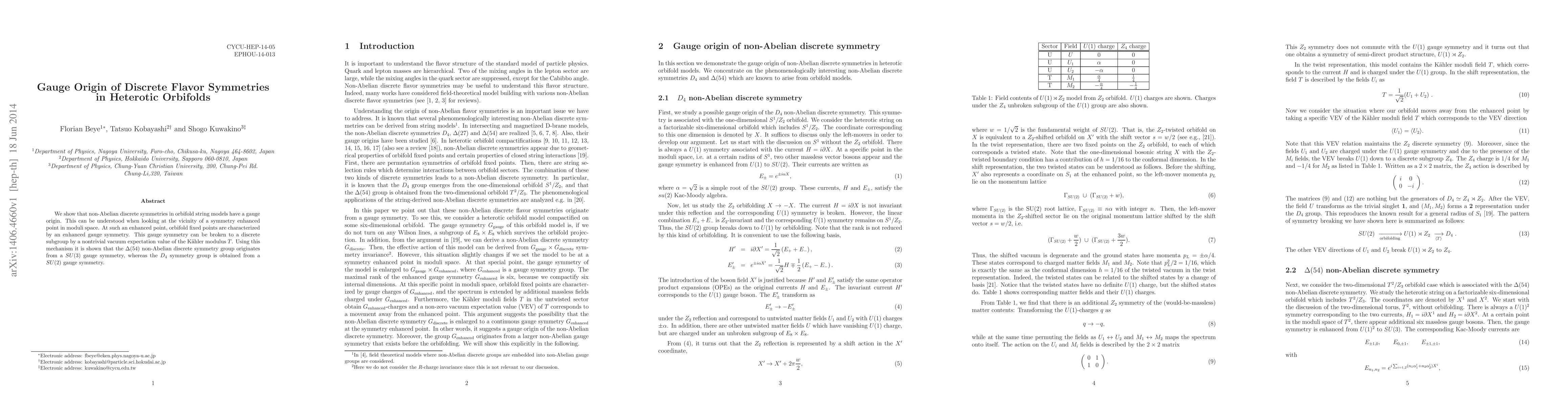 Researchers show that non-Abelian discrete symmetries in string models originate from gauge symmetries, which can break down to the desired symmetry group through a vacuum expectation value of the K"ahler modulus.