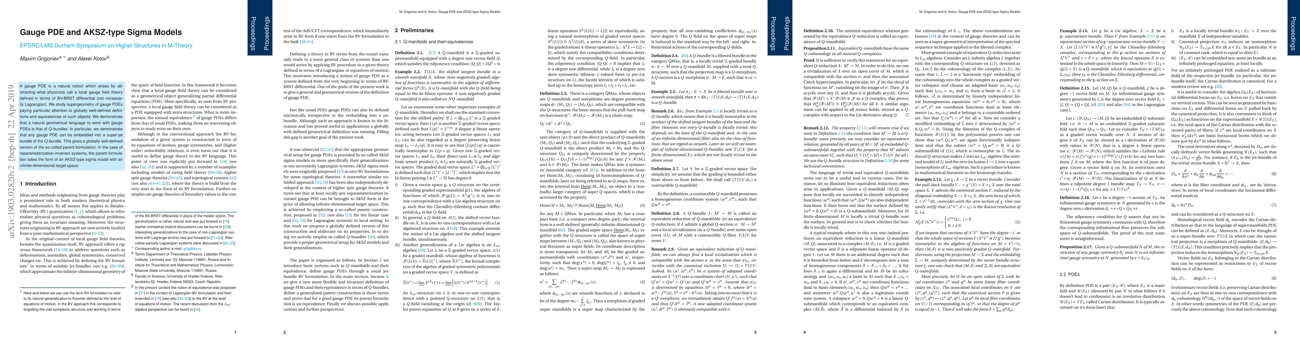 This paper explores the supergeometric framework of gauge partial differential equations (PDEs) and their global definitions, showing they can be embedded in $Q$-bundles. It concludes with the demonstration that reparameterization-invariant systems lead to AKSZ-type sigma models in an infinite-dimensional target space.