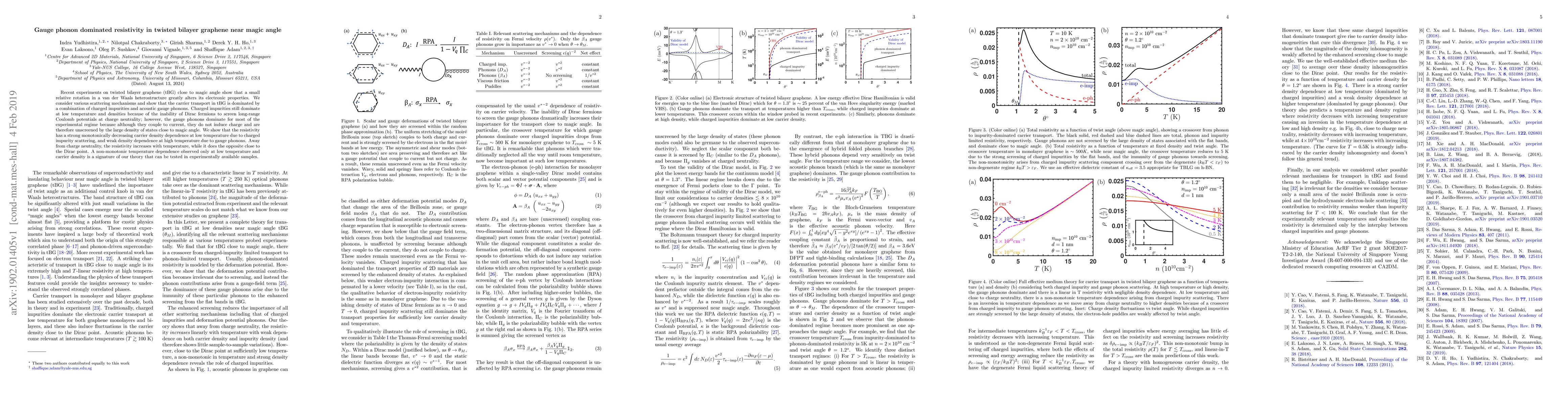 This paper explores the resistivity in twisted bilayer graphene near the magic angle, finding that it is dominated by charged impurities at low temperatures and densities, while gauge phonons play a significant role in most experimental conditions due to their unscreened coupling to current. The resistivity shows a strong decreasing dependence with carrier density at low temperatures and a non-monotonic temperature dependence at low carrier density, offering a testable prediction for future experiments.