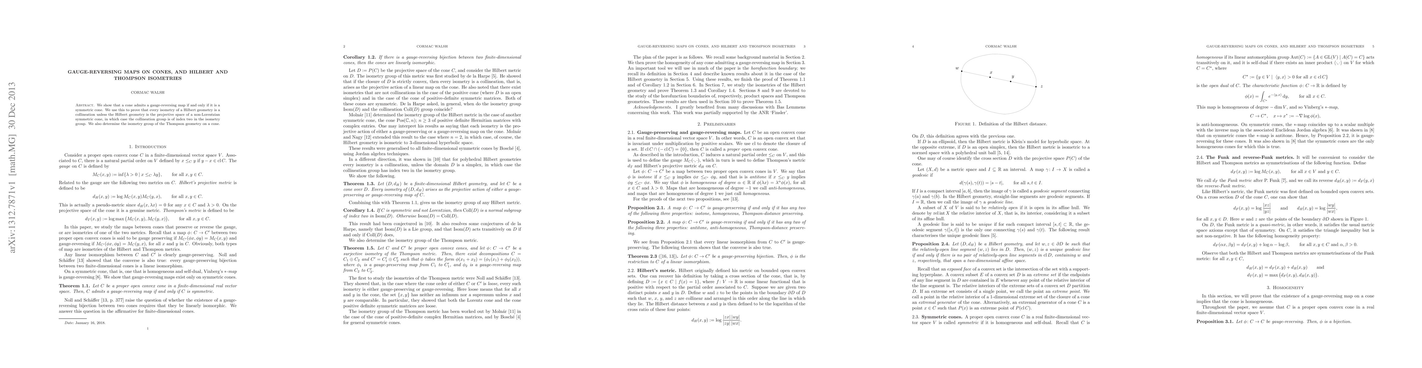 Summary: The paper demonstrates that symmetric cones are the only ones admitting gauge-reversing maps, and it shows that Hilbert geometry isometries are collineations except in the case of non-Lorentzian symmetric cones, where the collineation group is a subgroup of the isometry group. Additionally, it identifies the isometry group of Thompson geometry on a cone.