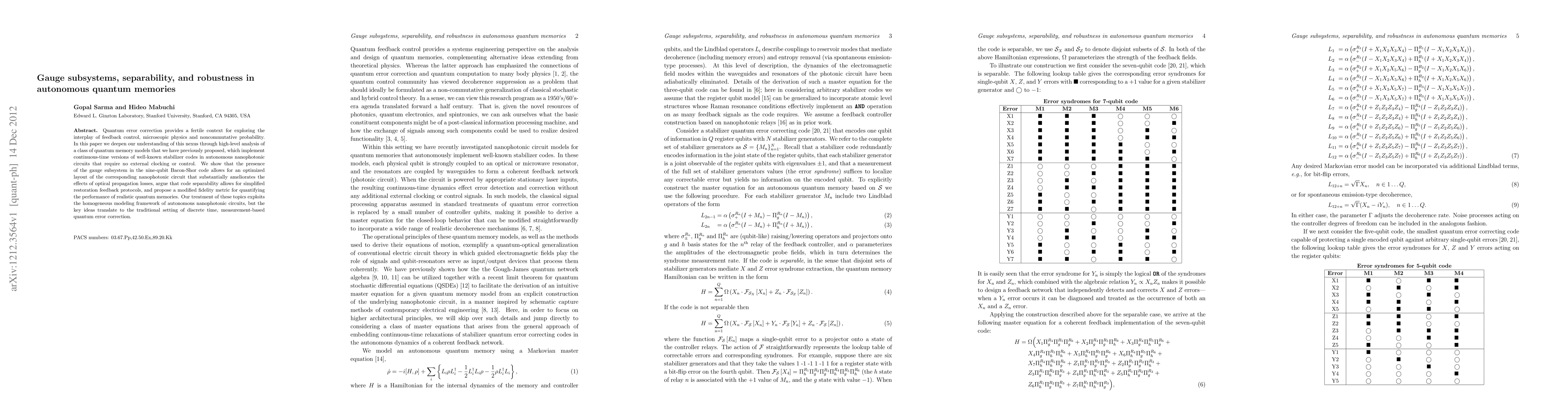 Quantum error correction provides a fertile context for exploring the interplay of feedback control, microscopic physics and noncommutative probability. In this paper we deepen our understanding of this nexus through high-level analysis of a class of quantum memory models that we have previously proposed, which implement continuous-time versions of well-known stabilizer codes in autonomous nanophotonic circuits that require no external clocking or control. We show that the presence of the gauge subsystem in the nine-qubit Bacon-Shor code allows for an optimized layout of the corresponding nanophotonic circuit that substantially ameliorates the effects of optical propagation losses, argue that code separability allows for simplified restoration feedback protocols, and propose a modified fidelity metric for quantifying the performance of realistic quantum memories. Our treatment of these topics exploits the homogeneous modeling framework of autonomous nanophotonic circuits, but the key ideas translate to the traditional setting of discrete time, measurement-based quantum error correction.