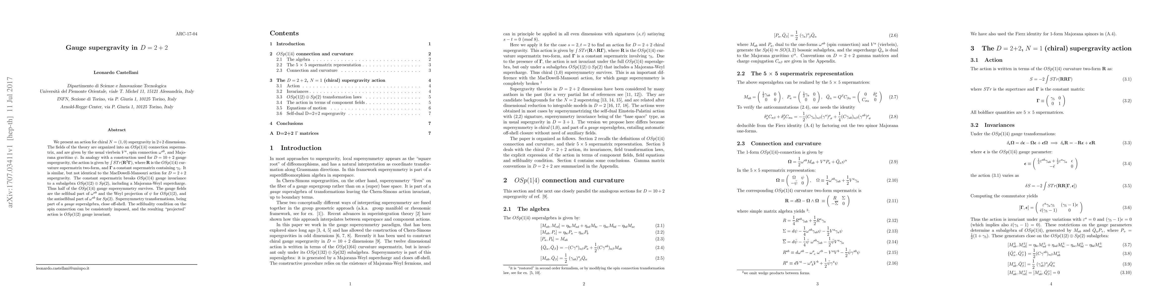 We present an action for chiral $N=(1,0)$ supergravity in $2+2$ dimensions. The fields of the theory are organized into an $OSp(1|4)$ connection supermatrix, and are given by the usual vierbein $V^a$, spin connection $\omega^{ab}$, and Majorana gravitino $\psi$. In analogy with a construction used for $D=10+2$ gauge supergravity, the action is given by $\int STr ({\bf R}^2 {\bf \Gamma})$, where ${\bf R}$ is the $OSp(1|4)$ curvature supermatrix two-form, and ${\bf \Gamma}$ a constant supermatrix containing $\gamma_5$. It is similar, but not identical to the MacDowell-Mansouri action for $D=2+2$ supergravity. The constant supermatrix breaks $OSp(1|4)$ gauge invariance to a subalgebra $OSp(1|2) \oplus Sp(2)$, including a Majorana-Weyl supercharge. Thus half of the $OSp(1|4)$ gauge supersymmetry survives. The gauge fields are the selfdual part of $\omega^{ab}$ and the Weyl projection of $\psi$ for $OSp(1|2)$, and the antiselfdual part of $\omega^{ab}$ for $Sp(2)$. Supersymmetry transformations, being part of a gauge superalgebra, close off-shell. The selfduality condition on the spin connection can be consistently imposed, and the resulting "projected" action is $OSp(1|2)$ gauge invariant.