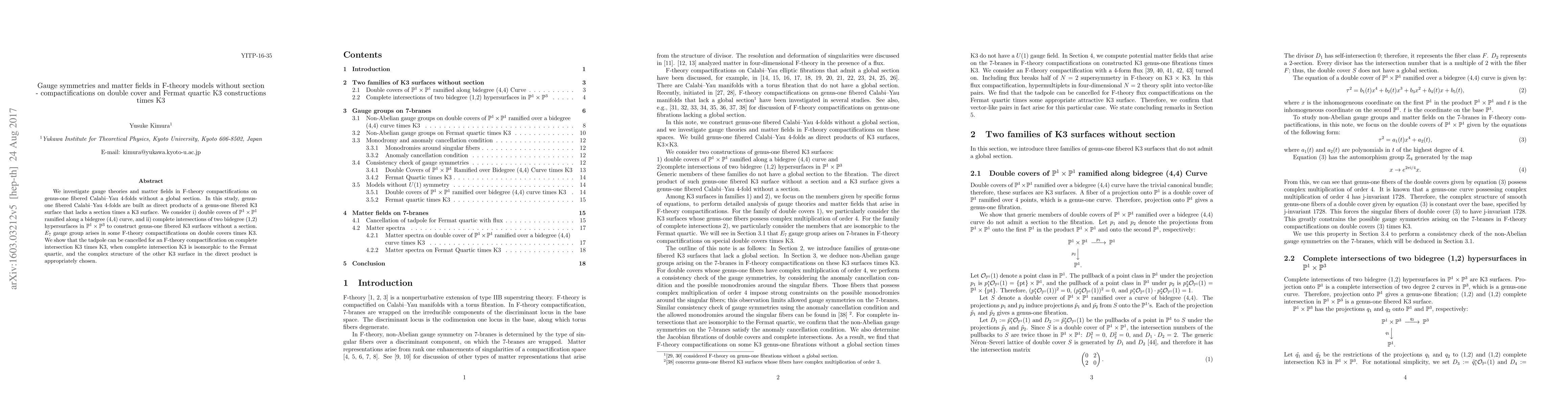 We investigate gauge theories and matter fields in F-theory compactifications on genus-one fibered Calabi-Yau 4-folds without a global section. In this study, genus-one fibered Calabi-Yau 4-folds are built as direct products of a genus-one fibered K3 surface that lacks a section times a K3 surface. We consider i) double covers of $\mathbb{P}^1\times\mathbb{P}^1$ ramified along a bidegree (4,4) curve, and ii) complete intersections of two bidegree (1,2) hypersurfaces in $\mathbb{P}^1\times\mathbb{P}^3$ to construct genus-one fibered K3 surfaces without a section. $E_7$ gauge group arises in some F-theory compactifications on double covers times K3. We show that the tadpole can be cancelled for an F-theory compactification on complete intersection K3 times K3, when complete intersection K3 is isomorphic to the Fermat quartic, and the complex structure of the other K3 surface in the direct product is appropriately chosen.