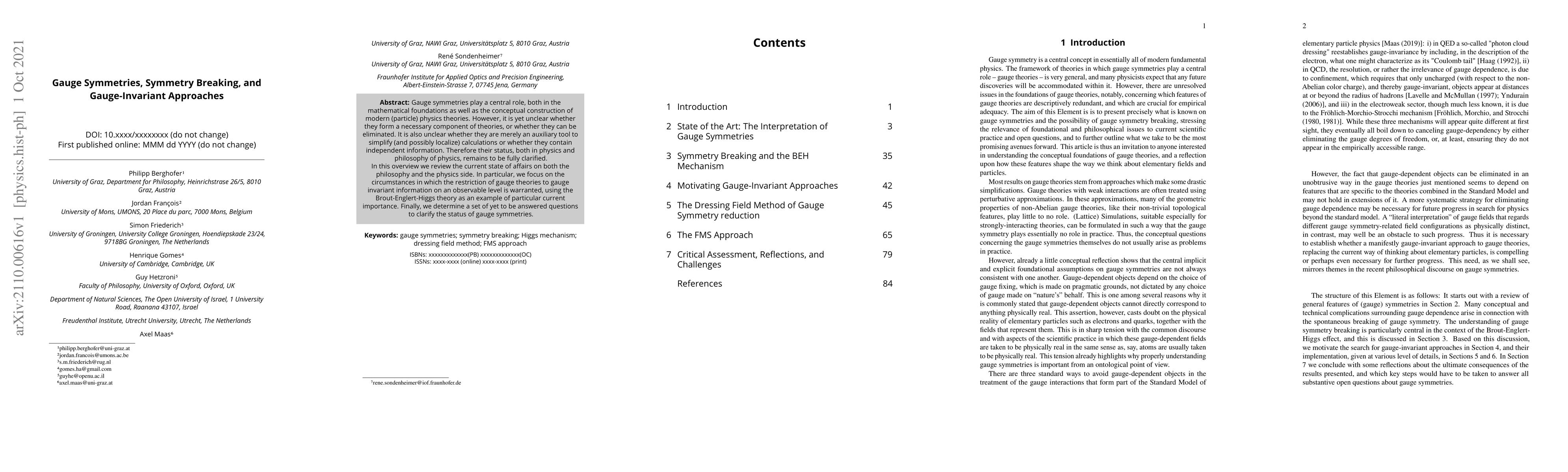 Gauge symmetries play a central role, both in the mathematical foundations as well as the conceptual construction of modern (particle) physics theories. However, it is yet unclear whether they form a necessary component of theories, or whether they can be eliminated. It is also unclear whether they are merely an auxiliary tool to simplify (and possibly localize) calculations or whether they contain independent information. Therefore their status, both in physics and philosophy of physics, remains to be fully clarified. In this overview we review the current state of affairs on both the philosophy and the physics side. In particular, we focus on the circumstances in which the restriction of gauge theories to gauge invariant information on an observable level is warranted, using the Brout-Englert-Higgs theory as an example of particular current importance. Finally, we determine a set of yet to be answered questions to clarify the status of gauge symmetries.