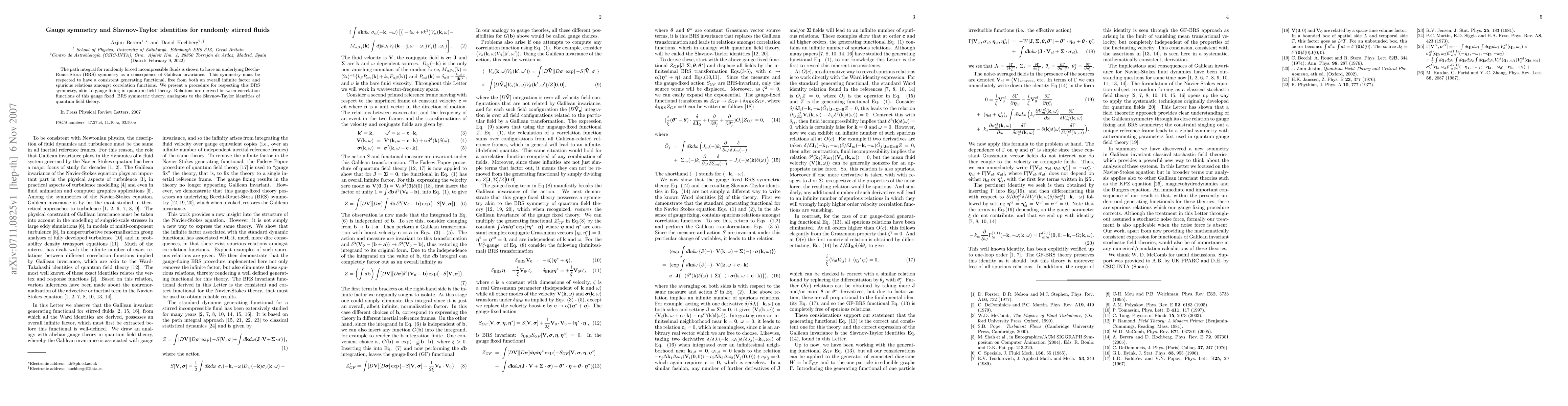 The path integral for randomly forced incompressible fluids is shown to have an underlying Becchi-Rouet-Stora (BRS) symmetry as a consequence of Galilean invariance. This symmetry must be respected to have a consistent generating functional, free from both an overall infinite factor and spurious relations amongst correlation functions. We present a procedure for respecting this BRS symmetry, akin to gauge fixing in quantum field theory. Relations are derived between correlation functions of this gauge fixed, BRS symmetric theory, analogous to the Slavnov-Taylor identities of quantum field theory.