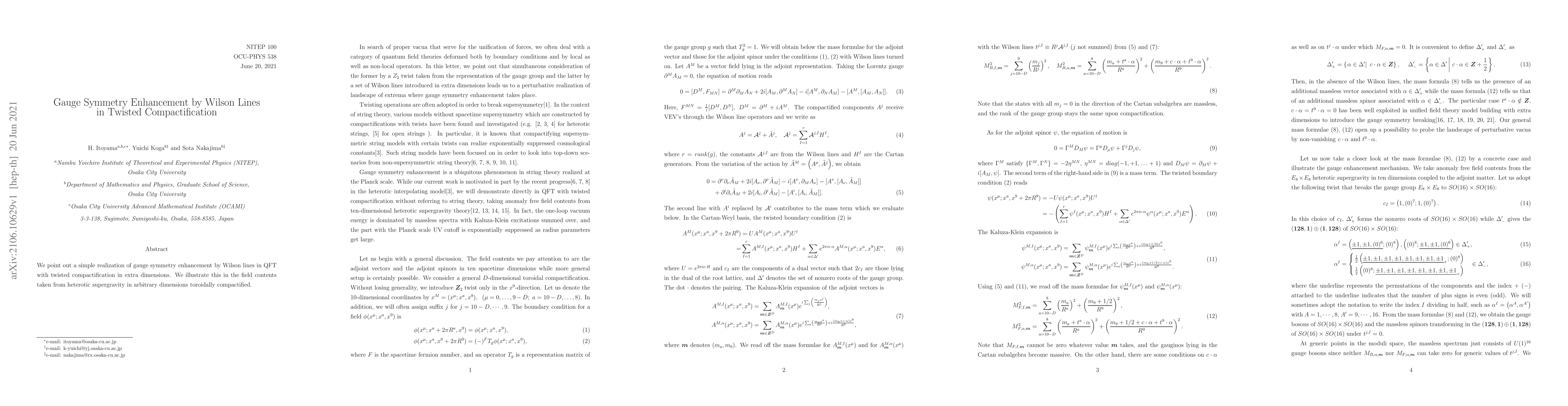 This paper demonstrates how gauge symmetry can be enhanced through Wilson lines in quantum field theories with twisted compactifications in extra dimensions, exemplified using field contents from heterotic supergravity in toroidally compactified spaces.