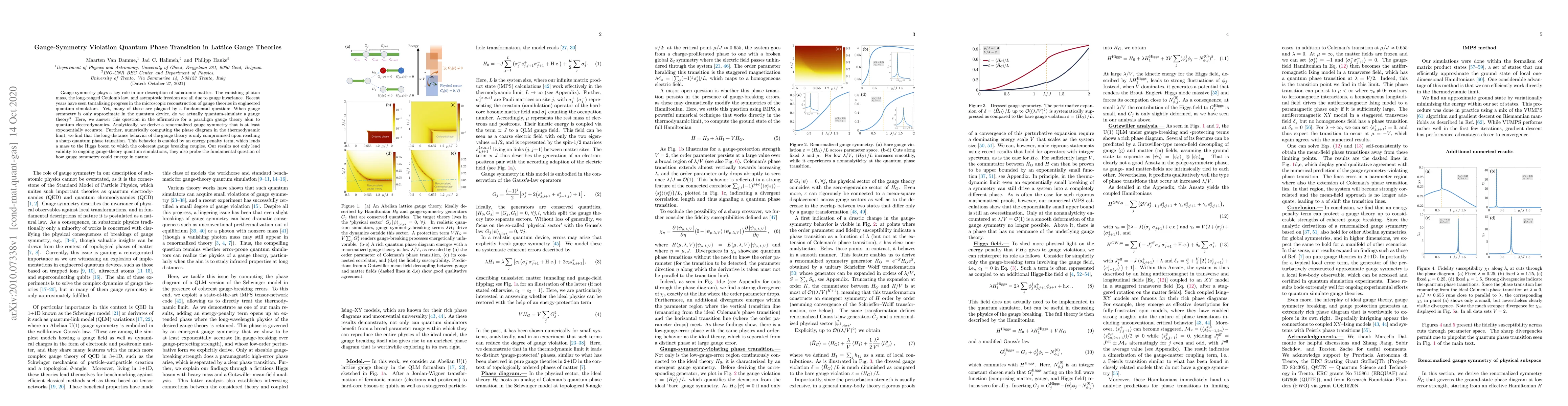This paper investigates the quantum phase transition in lattice gauge theories, demonstrating that gauge symmetry can be violated yet still accurately simulated in quantum devices. The study finds that a sharp quantum phase transition occurs when gauge symmetry is compromised, revealing the underlying mechanisms that maintain long-distance behavior.