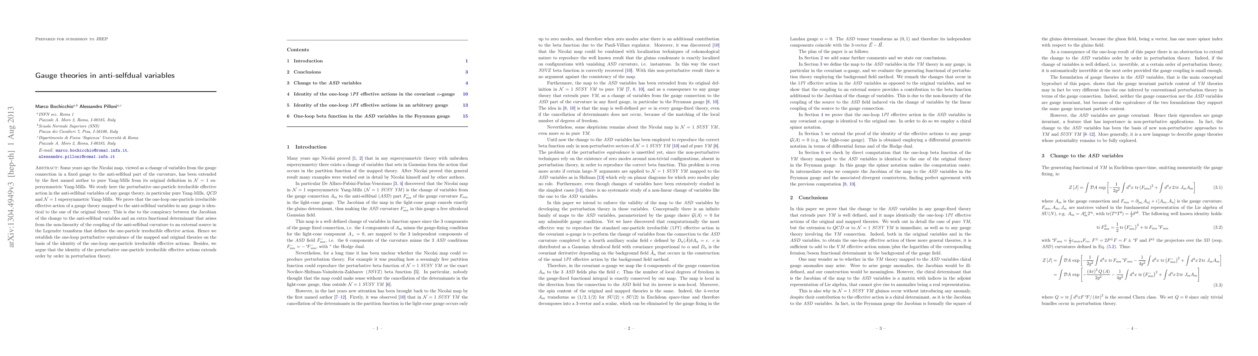 Some years ago the Nicolai map, viewed as a change of variables from the gauge connection in a fixed gauge to the anti-selfdual part of the curvature, has been extended by the first named author to pure YM from its original definition in N=1 SUSY YM. We study here the perturbative 1PI effective action in the anti-selfdual variables of any gauge theory, in particular pure YM, QCD and N=1 SUSY YM. We prove that the one-loop 1PI effective action of a gauge theory mapped to the anti-selfdual variables in any gauge is identical to the one of the original theory. This is due to the conspiracy between the Jacobian of the change to the anti-selfdual variables and an extra functional determinant that arises from the non-linearity of the coupling of the anti-selfdual curvature to an external source in the Legendre transform that defines the 1PI effective action. Hence we establish the one-loop perturbative equivalence of the mapped and original theories on the basis of the identity of the one-loop 1PI effective actions. Besides, we argue that the identity of the perturbative 1PI effective actions extends order by order in perturbation theory.