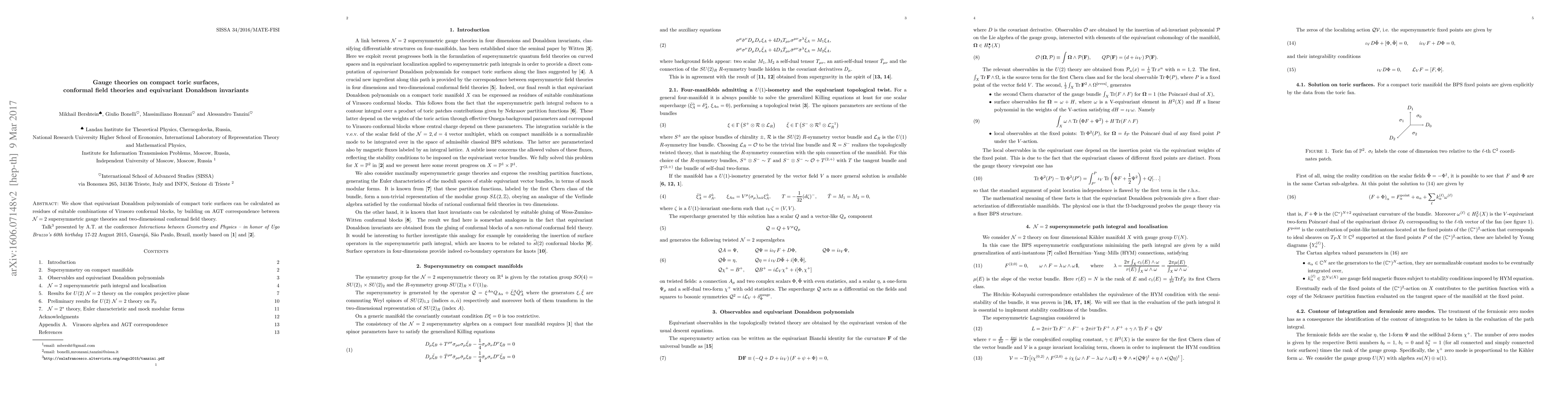 This research establishes a method to compute equivariant Donaldson invariants for compact toric surfaces through residues of Virasoro conformal blocks, leveraging the AGT correspondence linking N=2 supersymmetric gauge theories and two-dimensional conformal field theories.
