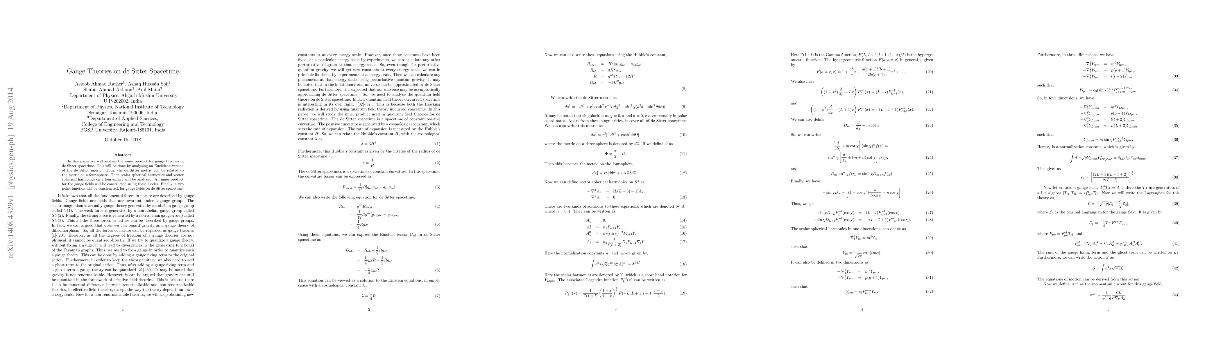 This paper analyzes the inner product for gauge theories in de Sitter spacetime by examining an Euclidean version of the de Sitter metric, relating it to a four-sphere, and constructing an inner product for gauge fields using scalar and vector spherical harmonics. A two-point function for gauge fields on de Sitter spacetime is also constructed.