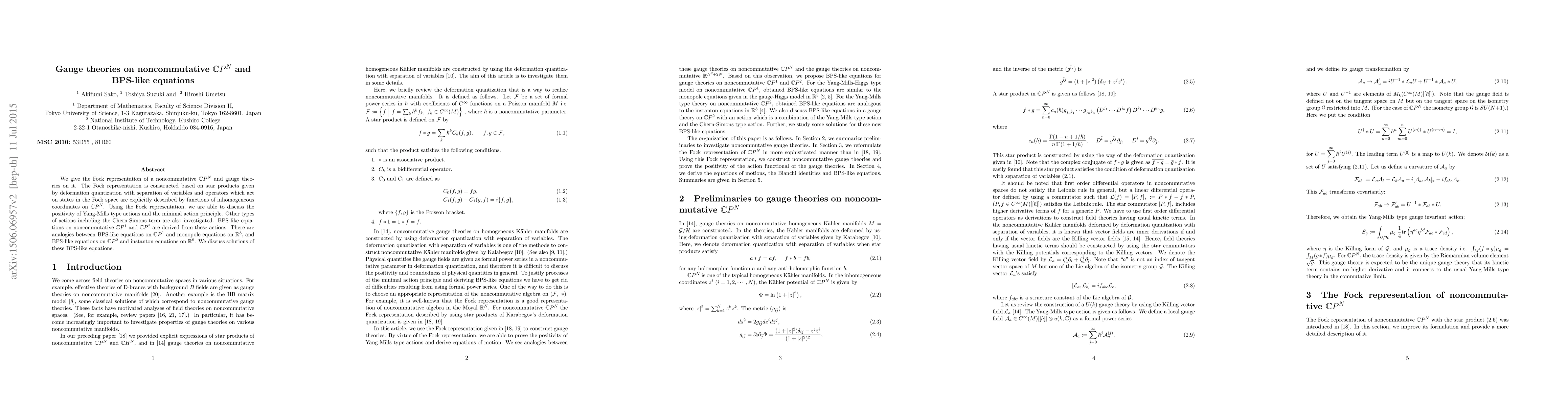 We give the Fock representation of a noncommutative $\mathbb{C}P^N$ and gauge theories on it. The Fock representation is constructed based on star products given by deformation quantization with separation of variables and operators which act on states in the Fock space are explicitly described by functions of inhomogeneous coordinates on ${\mathbb C}P^N$. Using the Fock representation, we are able to discuss the positivity of Yang-Mills type actions and the minimal action principle. Other types of actions including the Chern-Simons term are also investigated. BPS-like equations on noncommutative $\mathbb{C}P^1$ and $\mathbb{C}P^2$ are derived from these actions. There are analogies between BPS-like equations on $\mathbb{C}P^1$ and monopole equations on ${\mathbb R}^3$, and BPS-like equations on $\mathbb{C}P^2$ and instanton equations on ${\mathbb R}^8$. We discuss solutions of these BPS-like equations.