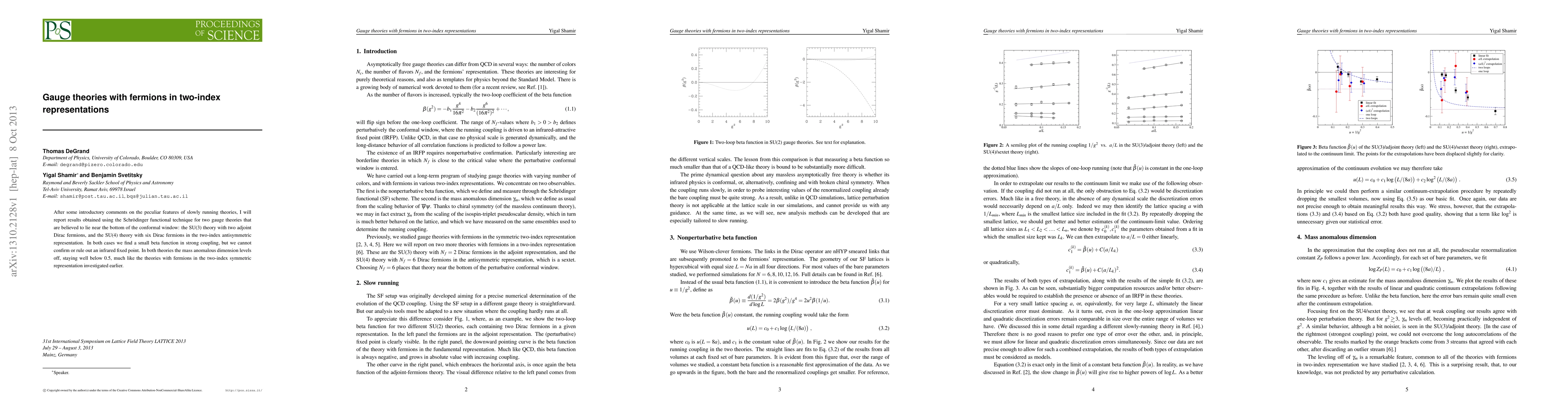 This paper investigates two gauge theories using the Schrödinger functional technique, finding small beta functions in strong coupling but no definitive evidence of an infrared fixed point. Both theories exhibit a mass anomalous dimension that remains below 0.5, similar to earlier studies on theories with fermions in two-index symmetric representations.