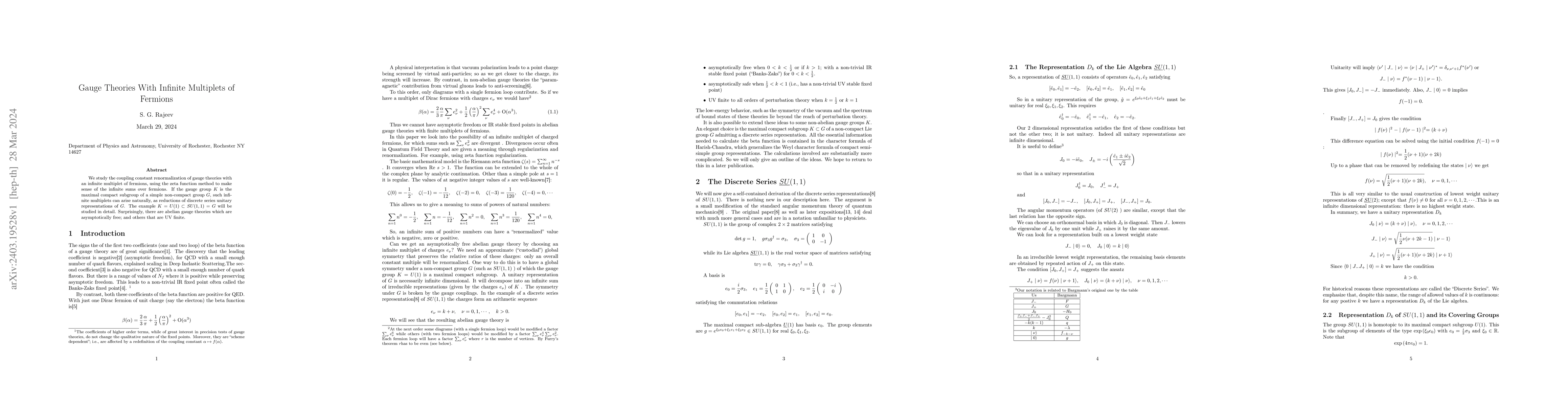We study the coupling constant renormalization of gauge theories with an infinite multiplet of fermions, using the zeta function method to make sense of the infinite sums over fermions. If the gauge group K is the maximal compact subgroup of a simple non-compact group G, such infinite multiplets can arise naturally, as reductions of discrete series unitary representations of G. The example K=U(1) and G=SU(1,1) will be studied in detail. Surprisingly, there are abelian gauge theories which are asymptotically free; and others that are UV finite.