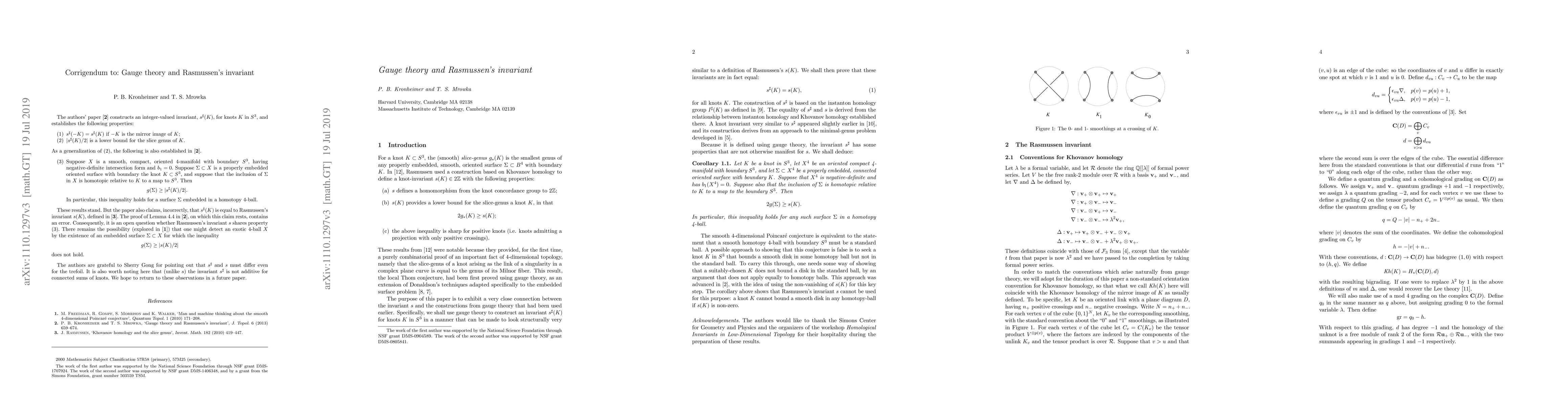 This paper revisits a previous claim about the equality of Rasmussen's knot-invariant s(K) and its gauge-theory counterpart, revealing an error in the original proof. The original paper and a corrigendum are provided, clarifying that the gauge-theory counterpart is not additive for connected sums.