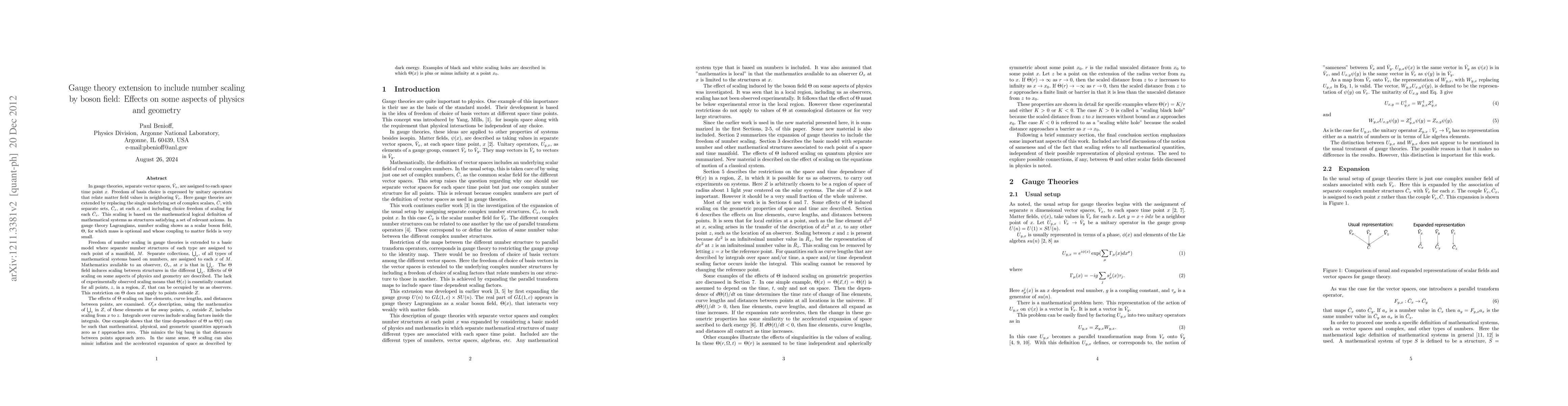 This paper extends gauge theories by incorporating a scalar boson field B to scale separate number structures Cx at each spacetime point, affecting physics and geometry. The B field induces scaling between different mathematical structures Ux, leading to effects on line elements, curve lengths, and distances, with implications resembling the big bang and the existence of black and white scaling holes.