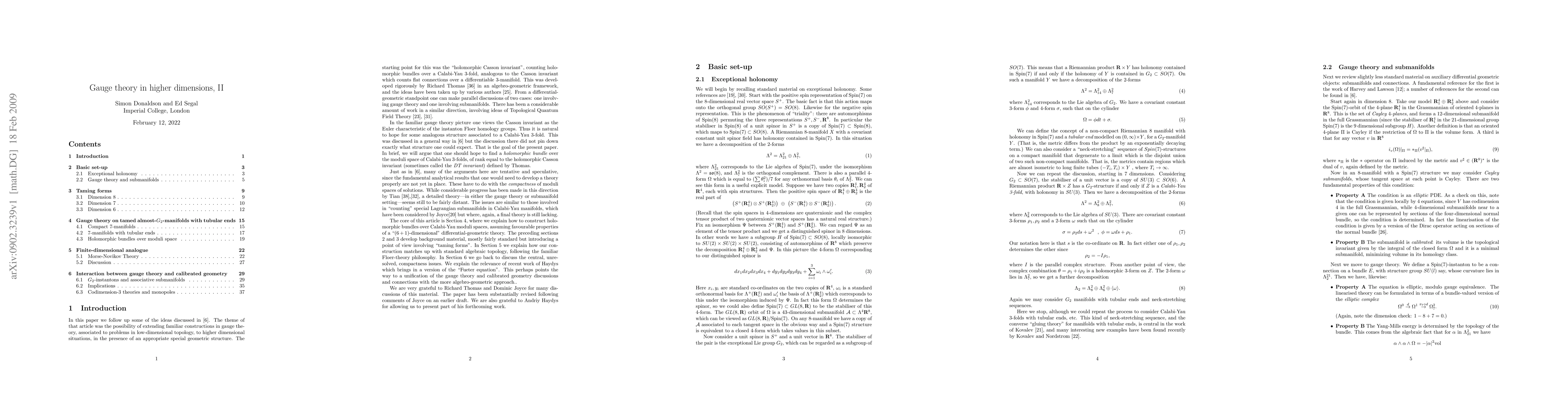 The paper advances the formalism of Floer theory in higher dimensions, specifically for Calabi-Yau 3-folds, by introducing a relative sign for solutions and discussing deformations of equations associated with gauge fields and submanifolds under exceptional holonomy.