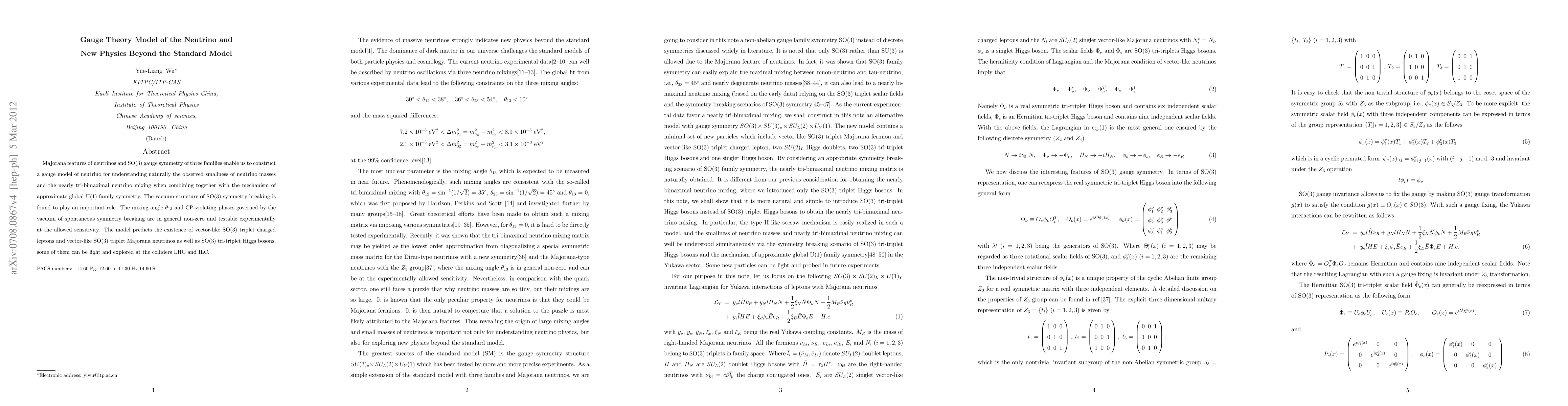 Majorana features of neutrinos and SO(3) gauge symmetry of three families enable us to construct a gauge model of neutrino for understanding naturally the observed smallness of neutrino masses and the nearly tri-bimaximal neutrino mixing when combining together with the mechanism of approximate global U(1) family symmetry. The vacuum structure of SO(3) symmetry breaking is found to play an important role. The mixing angle $\theta_{13}$ and CP-violating phases governed by the vacuum of spontaneous symmetry breaking are in general non-zero and testable experimentally at the allowed sensitivity. The model predicts the existence of vector-like SO(3) triplet charged leptons and vector-like SO(3) triplet Majorana neutrinos as well as SO(3) tri-triplet Higgs bosons, some of them can be light and explored at the colliders LHC and ILC.