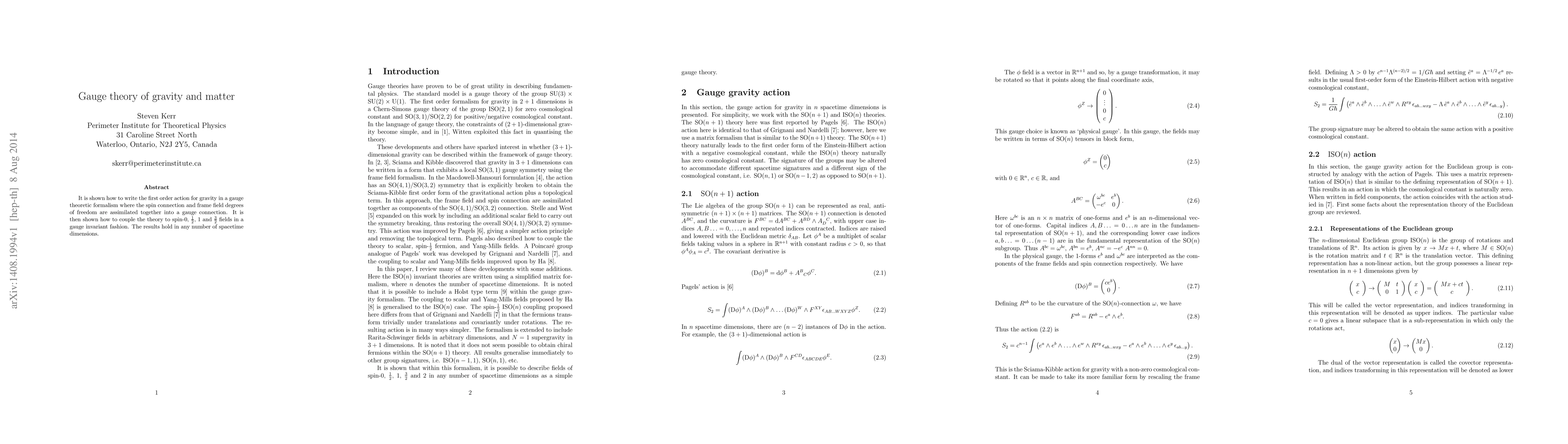 It is shown how to write the first order action for gravity in a gauge theoretic formalism where the spin connection and frame field degrees of freedom are assimilated together into a gauge connection. It is then shown how to couple the theory to spin-0, 1/2, 1 and 3/2 fields in a gauge invariant fashion. The results hold in any number of spacetime dimensions.