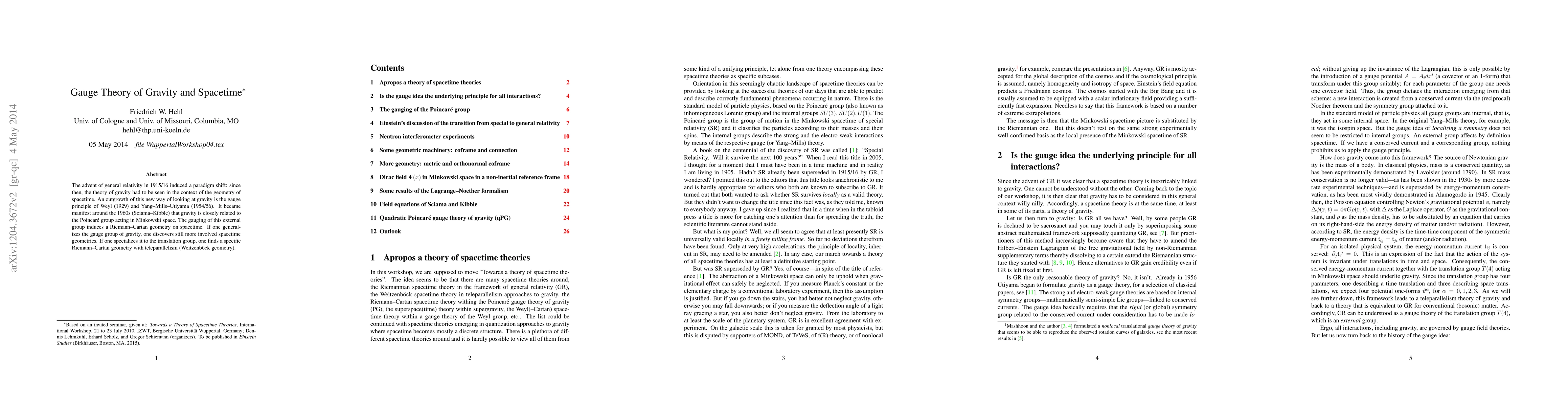 The advent of general relativity settled it once and for all that a theory of spacetime is inextricably linked to the theory of gravity. From the point of view of the gauge principle of Weyl and Yang-Mills-Utiyama, it became manifest around the 1960s (Sciama--Kibble) that gravity is closely related to the Poincare group acting in Minkowski space. The gauging of this external group induces a Riemann-Cartan geometry on spacetime. If one generalizes the gauge group of gravity, one finds still more involved spacetime geometries. If one specializes it to the translation group, one finds a specific Riemann-Cartan geometry with teleparallelism (Weitzenbock geometry).