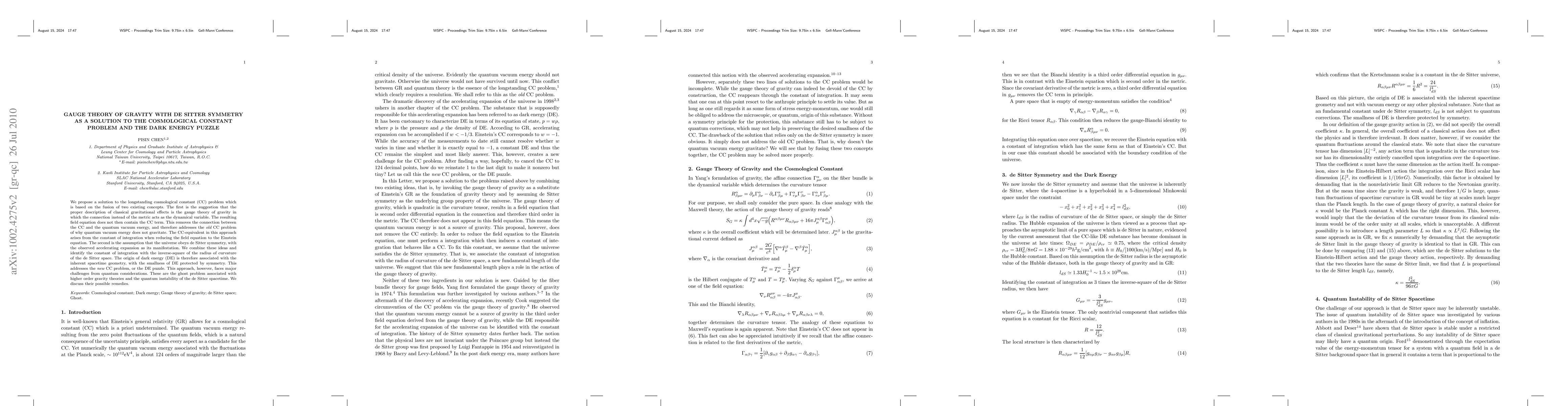 We propose a solution to the longstanding cosmological constant (CC) problem which is based on the fusion of two existing concepts. The first is the suggestion that the proper description of classical gravitational effects is the gauge theory of gravity in which the connection instead of the metric acts as the dynamical variable. The resulting field equation does not then contain the CC term. This removes the connection between the CC and the quantum vacuum energy, and therefore addresses the {\it old} CC problem of why quantum vacuum energy does not gravitate. The CC-equivalent in this approach arises from the constant of integration when reducing the field equation to the Einstein equation. The second is the assumption that the universe obeys de Sitter symmetry, with the observed accelerating expansion as its manifestation. We combine these ideas and identify the constant of integration with the inverse-square of the radius of curvature of the de Sitter space. The origin of dark energy (DE) is therefore associated with the inherent spacetime geometry, with the smallness of DE protected by symmetry. This addresses the {\it new} CC problem, or the DE puzzle. This approach, however, faces major challenges from quantum considerations. These are the ghost problem associated with higher order gravity theories and the quantum instability of the de Sitter spacetime. We discuss their possible remedies.