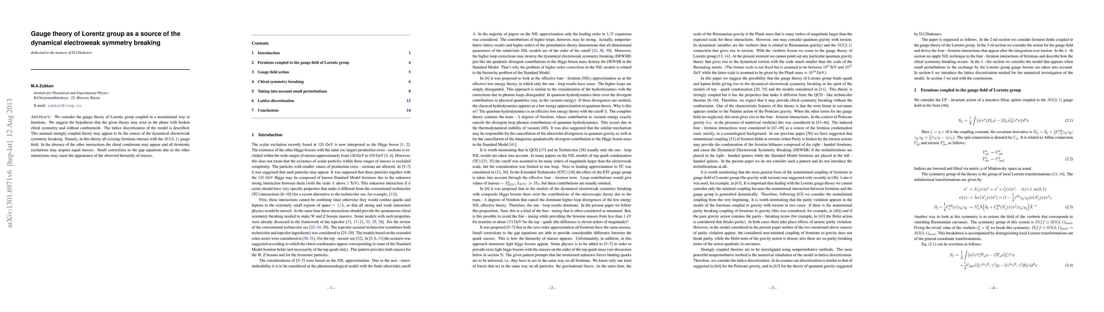 We consider the gauge theory of Lorentz group coupled in a nonminimal way to fermions. We suggest the hypothesis that the given theory may exist in the phase with broken chiral symmetry and without confinement. The lattice discretization of the model is described. This unusual strongly coupled theory may appear to be the source of the dynamical electroweak symmetry breaking. Namely, in this theory all existing fermions interact with the SO(3,1) gauge field. In the absence of the other interactions the chiral condensate may appear and all fermionic excitations may acquire equal masses. Small corrections to the gap equations due to the other interactions may cause the appearance of the observed hierarchy of masses.
