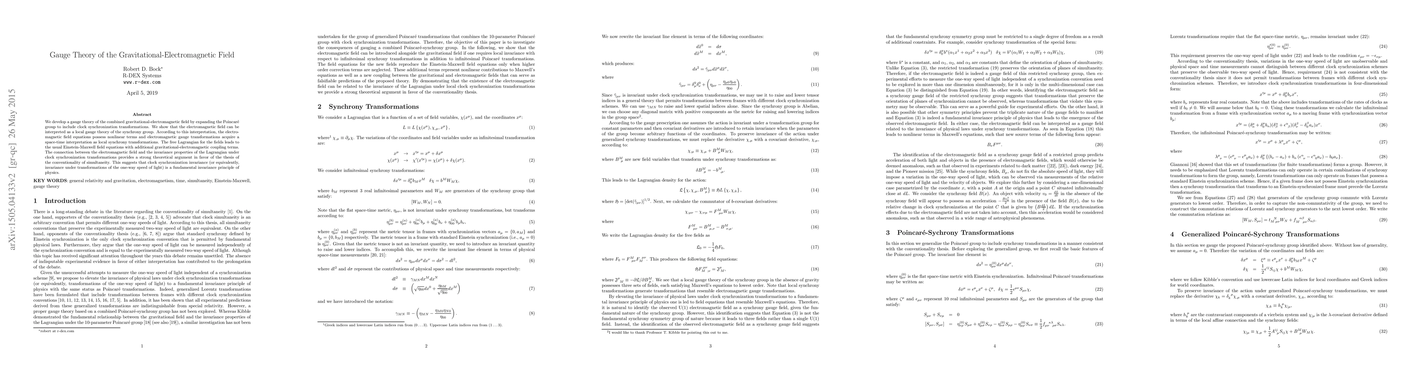 We develop a gauge theory of the combined gravitational-electromagnetic field by expanding the Poincar\'e group to include clock synchronization transformations. We show that the electromagnetic field can be interpreted as a local gauge theory of the synchrony group. According to this interpretation, the electromagnetic field equations possess nonlinear terms and electromagnetic gauge transformations acquire a space-time interpretation as local synchrony transformations. The free Lagrangian for the fields leads to the usual Einstein-Maxwell field equations with additional gravitational-electromagnetic coupling terms. The connection between the electromagnetic field and the invariance properties of the Lagrangian under clock synchronization transformations provides a strong theoretical argument in favor of the thesis of the conventionality of simultaneity. This suggests that clock synchronization invariance (or equivalently, invariance under transformations of the one-way speed of light) is a fundamental invariance principle of physics.