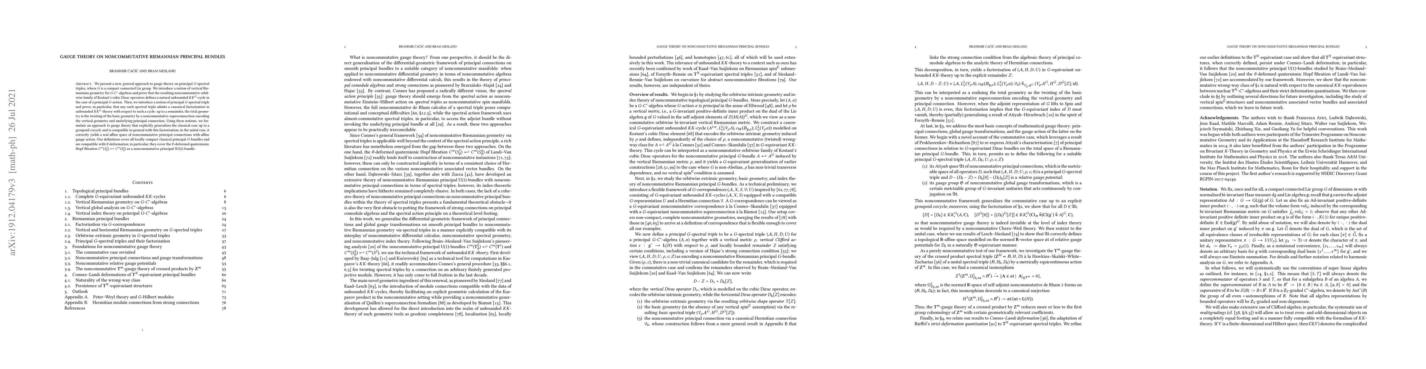 We present a new, general approach to gauge theory on principal $G$-spectral triples, where $G$ is a compact connected Lie group. We introduce a notion of vertical Riemannian geometry for $G$-$C^\ast$-algebras and prove that the resulting noncommutative orbitwise family of Kostant's cubic Dirac operators defines a natural unbounded $KK^G$-cycle in the case of a principal $G$-action. Then, we introduce a notion of principal $G$-spectral triple and prove, in particular, that any such spectral triple admits a canonical factorisation in unbounded $KK^G$-theory with respect to such a cycle: up to a remainder, the total geometry is the twisting of the basic geometry by a noncommutative superconnection encoding the vertical geometry and underlying principal connection. Using these notions, we formulate an approach to gauge theory that explicitly generalises the classical case up to a groupoid cocycle and is compatible in general with this factorisation; in the unital case, it correctly yields a real affine space of noncommutative principal connections with affine gauge action. Our definitions cover all locally compact classical principal $G$-bundles and are compatible with $\theta$-deformation; in particular, they cover the $\theta$-deformed quaternionic Hopf fibration $C^\infty(S^7_\theta) \hookleftarrow C^\infty(S^4_\theta)$ as a noncommutative principal $\operatorname{SU}(2)$-bundle.