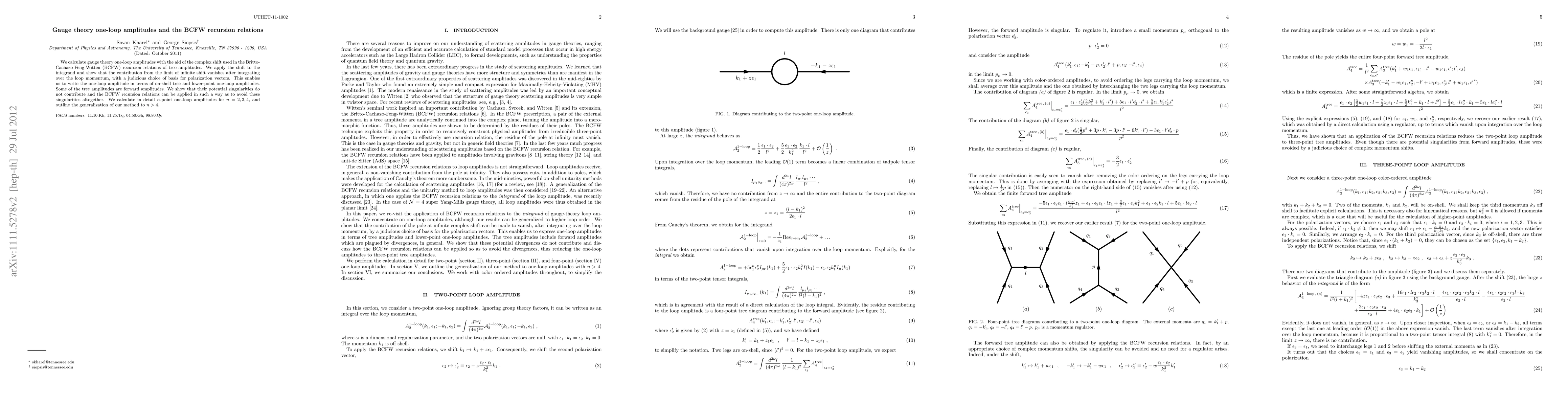 This paper calculates gauge theory one-loop amplitudes using the BCFW recursion relations, demonstrating that the infinite shift limit vanishes upon integration. It shows that these relations can be applied to avoid singularities in forward tree amplitudes and provides detailed calculations for $n=2,3,4$ one-loop amplitudes, with a method outlined for higher $n$.