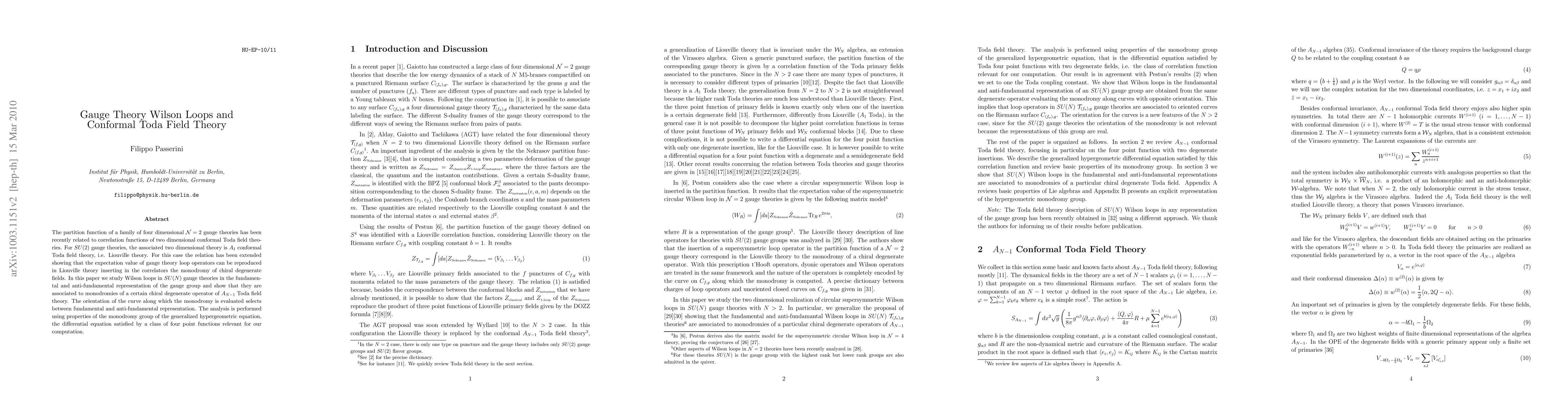 This paper explores the connection between gauge theory Wilson loops in SU(N) gauge theories and monodromies of chiral degenerate operators in A_{N-1} conformal Toda field theory, revealing how the representation of the gauge group is determined by the curve orientation. The analysis leverages properties of the monodromy group associated with a generalized hypergeometric equation.