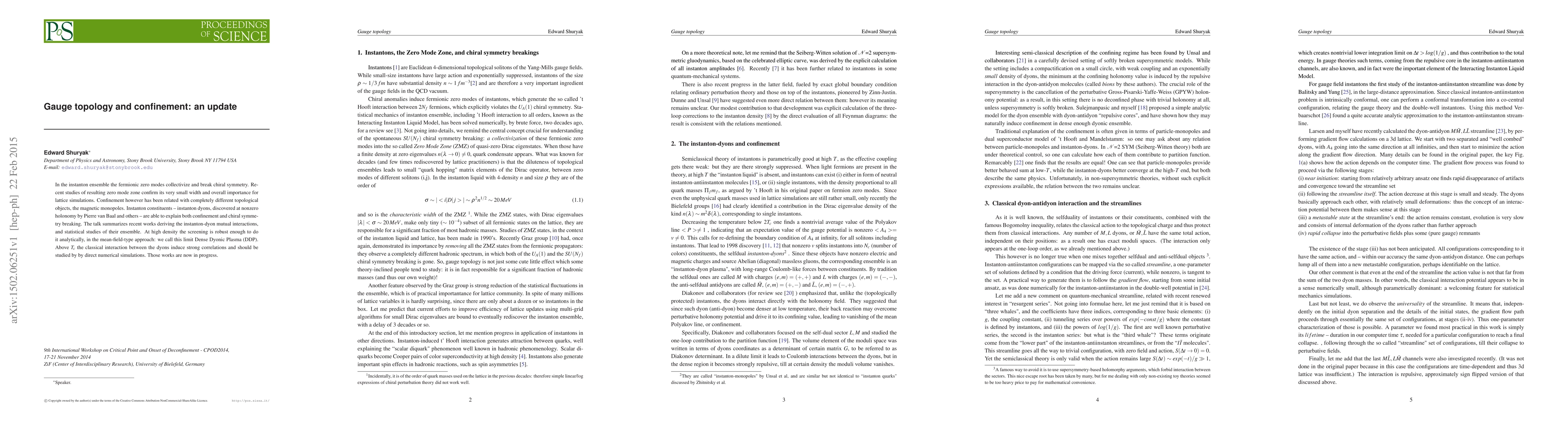 In the instanton ensemble the fermionic zero modes collectivize and break chiral symmetry. Recent studies of resulting zero mode zone confirm its very small width and overall importance for lattice simulations. Confinement however has been related with completely different topological objects, the magnetic monopoles. Instanton constituents -- instanton dyons, discovered at nonzero holonomy by Pierre van Baal and others -- are able to explain both confinement and chiral symmetry breaking. The talk summarizes recent works deriving the instanton-dyon mutual interactions, and statistical studies of their ensemble. At high density the screening is robust enough to do it analytically, in the mean-field-type approach: we call this limit Dense Dyonic Plasma (DDP). Above $T_c$ the classical interaction between the dyons induce strong correlations and should be studied by direct numerical simulations. Those works are now in progress.